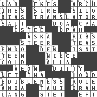 ACROSS 1. Pat or tap gently 4. Supplements with great effort 8. Bowlike part 12. Angers 14. The founder of a family 15. Grain storage tower 16. Prejudice 17. Interpreter 20. Table seasoning 21. ___ good deed 22. Accounting whiz (abbr.) 23. First name in cosmetics 27. Brightly colored fish 29. "____ silly question..." 31. Chest bones 34. Navigate 35. Afternoon social gatherings 36. Inside; within (prefix) 39. Morning condensation 41. Is not 42. Adolescent 43. Sibling's daughter 46. Chilled 47. Silent film actress Nazimova 48. Period of immesurable duration 51. Simple song 54. Fish or hair follower 56. _ tizzy (2 wds.) 58. Parka part 61. The property of being fit to eat 66. General guideline 67. Small Philippine buffalo 68. "Change" in Tahitian 69. NW Algerian seaport 70. Long (Scottish) 71. Proofreading order 72. Lizard (obsolete) DOWN 1. Claim 2. Roberta Peters solo 3. Calif. Air Force Base 4. Eastern Standard Time (abbr.) 5. Apertif with cassis 6. Period 7. Transmit 8. White ___ sheet 9. Actors Guy, Robert Welles, and Clint 10. Hoof sound 11. Israeli folk dance 13. Fast planes 18. "Barney Miller" actor Jack 19. Infant locale 24. Make lace 25. Compass dir. 26. Made supply last 28. Nick name for Arthur 30. Sports stadium 32. Bar 33. Fast jet (abbr.) 34. Something which is sent 36. And so on (abbr.) 37. Modern: prefix 38. Accusation by an informer 40. Rampant 44. Biblical high priest 45. Feline 49. Petroleum 50. Compass dir. 52. Through, poetically 53. You are 54. Be tempered by heat 55. Pulitzer Prize-winning author Ferber 57. Pismires 59. Norwegian king 60. Scratch 62. Container for groceries 63. Erode 64. Take to court 65. Be seated