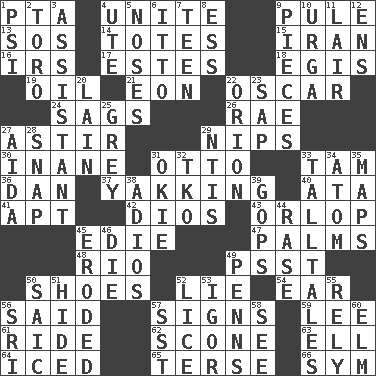 ACROSS 1. Parent Teacher Assoc. 4. Join together 9. Whine 13. Distress signal 14. Lugs 15. SW Asia republic 16. Big collection agency 17. _____ Park, CO 18. The front part of a cuirass 19. Lubricate 21. Period of immesurable duration 22. Motion picture award 24. Sinks 26. Actress Charlotte 27. Being in motion 29. Cuts off 30. Lacking in sense or substance 31. "Beetle Bailey" pooch 33. Scottish cap 36. Daniel's nick name 37. Chattering 40. _ moment's notice (2 wds.) 41. Fitting 42. "Vaya con ____" 43. Fourth or lowest deck 45. Singer Brickell 47. Insides of hands 48. _ de Janeiro 49. Inconspicuous attention getter 50. Imelda's hoard 52. Whopper 54. Hearing organ 56. Alleged 57. Public displays of written messages 59. Area sheltered from the wind 61. Travel on an animal 62. Biscuitlike quick bread 63. Pipe bend 64. On the rocks 65. Laconic 66. Symbol (abbr.) DOWN 1. Air pressure measure (abbr.) 2. "Corrida" creature 3. Aide 4. Shoshoni 5. Olfactory organs 6. "Tell ____ the Marines!" 7. Adolescent 8. Curvy letter 9. Parts 10. Capital and largest city of Mongolia 11. Den 12. Followers of ems 20. (Had) reclined 22. Constellation of myth 23. Plant excrement 25. Jennifer or Joel 27. Opera by Verdi 28. Fastener 29. Nuclear Threat Initiatives 31. Migrant worker of the '30s 32. Ring climax 33. Baron Munchausen's specialties 34. Tiny particle 35. Atlas contents 38. Goodbye (Sp.) 39. Republicans 44. To erase 45. Worn away 46. Expire 49. Actor Sean's family 50. Ketch in the Levant 51. Flintstone garb 52. Louse (plural) 53. Russian composer Stravinsky 55. Have confidence or faith in 56. _ Lanka 57. Fast jet (abbr.) 58. Perceive with the eye 60. Shade tree