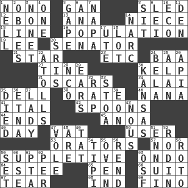 ACROSS 1. Words to Nanette 5. Separate the seeds from cotton 8. Downhill vehicle 12. Inky black, to poets 13. Santa ___, CA 14. Sibling's daughter 15. Actor's bit 16. Census information 19. Area sheltered from the wind 20. Elected representative 21. Play the lead 23. And so on (abbr.) 24. Sound made by sheep 27. Prong on a fork 30. Seaweed 31. Motion picture awards 34. Jai ____ 35. Small valley 38. Declaim 40. Nanny 41. Slanted text style (abbr.) 42. Soup utensils 44. Conclusions 45. Small Philippine buffalo 46. 24 hours 47. Large container 50. One who makes use of a thing 53. Speakers 57. Or not 59. Supplementary 63. Southwest Nigerian state 64. First name in cosmetics 65. Fenced enclosure 66. Costume for a special activity 67. Pull apart 68. Working for oneself (abbr.) 69. Fine (Spanish) DOWN 1. 1994 drama film starring Jodie Foster 2. Off-Broadway awards 3. Music written for nine 4. Single 5. Stare wonderingly 6. Soon (poet.) 7. California wine valley 8. Be seated 9. Flowery wreath 10. Environmental prefix 11. Lair 14. Drug cop 17. Shoshoni 18. Car dealer's back yard 20. Indian titles of respect 22. Ringlike coral islands and reefs 24. Actor Lugosi 25. Actor Alda or Thicke 26. Capital of Western Samoa 28. Non-commissioned officer (abbr.) 29. Hearing organs 30. Sunflower state 32. Strike 33. Portico 35. Passed on 36. Inactive volcano in Sicily 37. Kenny Rogers chart-topper in '80 39. Age 43. Common sense 47. Short-tailed, large-bodied rat 48. "We ___ not amused" (Victoria) 49. Make lace 51. World-weariness 52. "The Thinker" sculptor 54. Native american tent (variation) 55. Baking chamber 56. Tear apart 58. Printing process, for short 59. Put into a specified state 60. Purpose 61. Parent Teacher Association (abbr.) 62. For each 63. Order of Saint Francis (abbr.)