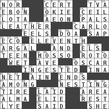 ACROSS 1. Or not 4. An absolute certainty 8. Federal power corp. 11. Inky black, to poets 13. Migrant worker of the '30s 14. To provide with a ceiling 15. Globular water bottle used in Asia 16. A really long time 17. Friends 18. Cordwainer's material 21. Monte _, Las Vegas Hotel/Casino 22. Snakelike fish 23. ___ good deed 25. Plant excrement 26. Environmental prefix 29. Veterans Day date 32. Therefore, facetiously 34. Also 35. Raised railways 38. Adolescent 39. With motion or animation 41. Printing process, for short 43. Soggy 44. "___ Maria" 45. Witty Wilde 46. Swallowed 50. _ tizzy (2 wds.) 51. Fish or hair follower 54. The 18th letter of the Arabic alphabet 55. Extremities 57. Amid 59. Nestling 63. Hoop that covers a wheel 64. Put down 67. Type of rug 68. _ mater 69. Writer Wiesel 70. Repose 71. Potassium hydroxide 72. Stated 73. A female animal or person DOWN 1. 1994 drama film starring Jodie Foster 2. Mitch Miller's instrument 3. Round or rotation of duties 4. Unrefined 5. Make supply last 6. _ de Janeiro 7. Nine, plus one 8. Pulls into pieces 9. Country estate 10. Columnist Joseph or Stewart 12. Nathan's nickname 14. Numbers guy (abbr.) 19. The bottom of a shoe or boot 20. Pipe bend 21. Feline 23. Cub Scout units 24. Southwest Nigerian state 26. Ingest 27. Group working together 28. Double curve, resembling the letter S 30. Flower holders 31. Possessive pronoun 33. Against 36. Locales 37. Comedian Laurel of Laurel & Hardy 39. Wise men 40. Baking chamber 42. Mouth or opening 45. Likelihood 47. Tired old horse 48. Looked after 49. Compass dir. 51. Brizilian seaport 52. Poet Dickinson 53. Singer Mel 56. Play the lead 58. Teachers' org. 60. Angers 61. Tender 62. Yard entry 64. French article 65. According to 66. One more than two