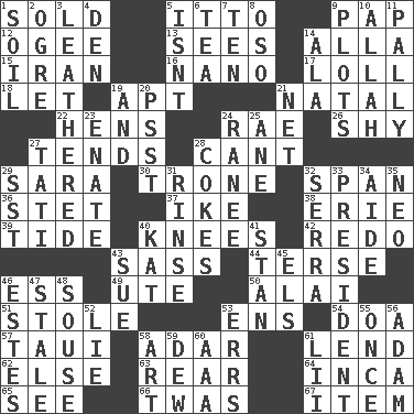 ACROSS 1. Disposed of to a purchaser 5. "Tell ____ the Marines!" 9. Infant food 12. Double curve, resembling the letter S 13. Perceives with the eye 14. Silent film actress Nazimova 15. SW Asia republic 16. Billionth: prefix 17. Hang loosely or laxly 18. Allow 19. Fitting 21. Brizilian seaport 22. Coop moms 24. Actress Charlotte 26. Like a shrinking violet 27. Is inclined (to) 28. Patter 29. "Two Mules for Sister ____" 30. Heavy duty weighing machine 32. Connect, as a bridge 36. Proofreading order 37. D.D.E's nickname 38. One of the Great Lakes 39. Event that recurs at intervals 40. Leg joints 42. Redecorate 43. Backtalk 44. Laconic 46. Curvy letter 49. Shoshoni 50. Mountain range southwest of Kyrgyzstan 51. Took without asking 53. Followers of ems 54. ___ good deed 57. "Change" in Tahitian 58. The sixth month of the Jewish calendar 61. Grant temporary use of 62. Otherwise 63. Stern 64. South American Indian 65. Perceive with the eye 66. It was, poetically 67. Detail DOWN 1. The visible part of the earth's surface 2. Legendary monster 3. Resembling or made to resemble leather 4. Lair 5. Is not 6. Afternoon social gathering 7. "___ Little Indians" 8. Bear (Spanish) 9. Secret plans 10. Assad's deity 11. Friendly 14. In the manner of 19. Also 20. Inconspicuous attention getter 21. Fish or hair follower 23. Related on the mother's side 24. The wife of a rajah (variant) 25. One (Scot) 27. Jacques of French films 28. Popular sodas 29. Fast jet (abbr.) 31. Remove soap 32. Father Junipero _ 33. Elected leader of a country 34. Helper 35. Modern: prefix 40. Krazy ___ of comics 41. Comedian Laurel of Laurel & Hardy 43. Take to court 45. Raised railways 46. _____ Park, CO 47. Showing deterioration from age 48. Boozer 52. Whopper 53. Blunders 55. At one time in the past 56. First man 58. Tate display 59. Morning condensation 60. Auto club (abbr.) 61. Cards in a Roman deck?
