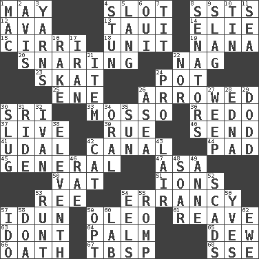ACROSS 1. Fifth month 4. Position in a hierarchy or organization 8. Fast planes 12. Actress Gardner 13. "Change" in Tahitian 14. Writer Wiesel 15. High-altitude cloud 18. A single undivided whole 19. Nanny 20. Catching in a trap 22. Tired old horse 23. Three-handed card game 24. Plant holder 25. Compass dir. 26. Moved like an arrow 30. Indian title of respect (Mr.) 33. With motion or animation 36. Redecorate 37. Not recorded 39. Sorrow 40. Transmit 41. Hereditary estate 42. Lessep's creation 44. Writing tablet 45. Commissioned military rank 47. White ___ sheet 50. Large container 51. Charged particles 53. To separate or throw off 54. The state or an instance of erring 57. Goddess of spring and wife of Bragi 59. Margarine 61. Rob, plunder, or pillage 63. Do not 64. Inside of hand 65. Morning condensation 66. Pledge 67. Cook's measure (abbr.) 68. Compass dir. DOWN 1. Big _ 2. Deliberation 3. Tall tales 4. Make senseless or dizzy 5. Long (Scottish) 6. Fr. "Yes" 7. Teat (slang) 8. Legislators 9. Volcanic refuse 10. Shallow baking pan 11. Ocean 16. Immoral or dissolute person 17. SW Asia republic 21. A whole individual unit 22. And not 24. Adept person 26. At sea 27. Shed a tear 28. Pulitzer Prize-winning author Ferber 29. Texas town _ City 30. A hard, heavy blow 31. Travel on an animal 32. "Terrible" tsar 34. Of the mouth 35. Player for Phoenix 38. Veterans Day date 42. Domesticated feline 43. Den 46. Actress Charlotte 48. Fly high 49. Singer Murray 52. Heaps 53. Undersized animal 54. Snakelike fish 55. Play 56. Jacques Cousteau's middle name 57. Wedding promise 58. ___ good deed 59. Elect 60. Experiment locale 62. She-sheep