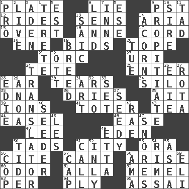 ACROSS 1. Food holder 6. Untruth 9. Pacific Standard Time (abbr.) 12. Amusement-park features 13. Elected reps. 14. Operatic vocal solo 15. Unconcealed 16. Singer Murray 17. Drawstring 18. Compass dir. 19. Auction offers 20. Drink excessively 21. Torque (variant) 23. RI univ. 24. False hair 25. Keyboard key 28. Ewer handle 30. Separates forcefully 34. Grain storage tower 35. Heredity factor (abbr.) 36. Frees from moisture 38. Small island 39. Charged particles 41. Carrier 43. Afternoon social gathering 44. Artist's stand 46. Comfort 48. Area sheltered from the wind 49. Paradise 50. Small boys 51. Municipality 53. Mouth or opening 56. Quote 57. Patter 58. Originate 60. Scent 61. Silent film actress Nazimova 62. Klaipeda city 63. For each 64. Apply oneself diligently 65. Slender Brazilian palm DOWN 1. Adept person 2. Moving, as bait 3. An important port of Yemen 4. Cigar-shaped 5. Eastern Standard Time (abbr.) 6. Grant temporary use of 7. Taverns 8. Compass dir. 9. Conciliate 10. Male parent of an animal 11. Small boy 13. Ketch in the Levant 14. Oak nuts 19. A special lineage 20. Third day of the wk. 22. Baseball player Mel 24. Interpreter 26. Writer Wiesel 27. Round or rotation of duties 28. Singer Brickell 29. Small Philippine buffalo 31. Nonscientific branch of learning 32. _ de Janeiro 33. Arrange properly for use 37. Shabby and untidy 40. Sowing specialist 42. Actress Charlotte 45. French article 47. Sounds asleep 49. Singer James 50. Periodic rise and fall of the sea level 51. Give a ring to 52. Inwardly 54. Basketball hoops 55. At sea 56. Police officer (slang) 57. Head covering 58. Nursemaid (var.) 59. Connecticut Ivy Leaguer