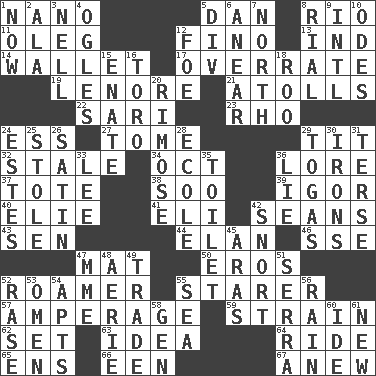 ACROSS 1. Billionth: prefix 5. One of the 12 tribes of Israel 8. River (Sp.) 11. Cassini of fashion 12. Fine (Spanish) 13. Working for oneself (abbr.) 14. Place for singles 17. Make much ado about nothing 19. Poe poem 21. Ringlike coral islands and reefs 22. Indian skirt 23. 17th letter of the Greek alphabet 24. Double-curved letter 27. Heavy book 29. Teat (slang) 32. Lacking originality or spontaneity 34. Sep. follower 36. Old wives' tales, e.g. 37. Carry 38. "Barney Miller" actor Jack 39. Composer Stravinsky 40. Writer Wiesel 41. Biblical high priest 42. Actors Connery and Penn 43. Elected rep. 44. Style 46. Compass dir. 47. Floor covering 50. Greek god of love 52. Nomad 55. A viewer who gazes fixedly 57. Electrical Measurement 59. Put through a sieve 62. Put into a specified state 63. The content of cognition 64. Travel on or in a vehicle 65. Followers of ems 66. Car or cant ending 67. Afresh DOWN 1. At this time 2. Insect wing 3. 1994 drama film starring Jodie Foster 4. Stares at amorously 5. HTML Container Element 6. Approach 7. Compass direction 8. Monetary unit of Yemen 9. International (abbr.) 10. Lyric poems 12. Enemy 15. Maternal 16. "Corrida" creature 18. Friend of Pooh 20. Full of chinks, cracks, or crevices 24. _____ Park, CO 25. Fur scarf 26. Smooth fabric 28. Learning spot: Fr. 29. Ancient Roman robes 30. Removes the wrinkles 31. Laconic 33. Area sheltered from the wind 35. Bathroom 36. Untruth 42. Derisive sound 45. Ancient river in northeast Turkey 47. Madame (abbr.) 48. Nest on high 49. Swap 51. Spanish missionary in California 52. Raze (variant) 53. Sign of something about to happen 54. Flats, for short 55. Ocean 56. Water falling in drops from the sky 58. Commissioned military rank (abbr.) 60. Binary compound 61. ___ Haven, CT