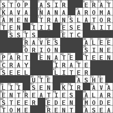 ACROSS 1. Constrict 5. SW Saudi Arabia district 9. Part of Q.E.F. 13. Polynesian shrub of the pepper family 14. Grandmother 15. Odor 16. So be it 17. Interpreter 19. Nine, plus one 20. One more than two 21. Compass dir. 22. Small island 23. Fast planes 25. And so on (abbr.) 26. All-night dance parties 30. Toward shelter 34. Greek mythologigal hunter 35. Trig term 36. Piece 39. Maternal 42. Adolescent 43. Supercomputer manufacturer 44. Feeling or showing extreme anger 46. Stitch closed the eyes of (a falcon) 47. 61 cubic inches 48. Shoshoni 51. American tennis player Robert 54. Cards in a Roman deck? 57. Elected rep. 58. Apertif with cassis 60. Actress Gardner 62. Pleas 65. Having or resembling wings 66. Bull 67. Genesis locale 68. Method 69. Heavy book 70. Monthly bill 71. At sea DOWN 1. Three-handed card game 2. Makes less strong or intense 3. Baking chambers 4. Baking dish 5. Against 6. Indian skirt 7. _ tizzy (2 wds.) 8. The wife of a rajah (variant) 9. Period 10. Round or rotation of duties 11. Mine, in Marseilles 12. Small pie 15. Actor Baldwin 18. Fast jet (abbr.) 20. Austrian river, tributary to the Danube 24. TNT 27. Compete 28. A really long time 29. Slow-paced one 30. Michaelmas daisies 31. Untruth 32. Compass dir. 33. Car or cant ending 36. Personal Computers (abbr.) 37. "We ___ not amused" (Victoria) 38. Actress Charlotte 40. Three (prefix) 41. Consume 45. Lacerate 48. One who uses or employs something 49. Afternoon social gathering 50. Keyboard key 52. Rings 53. Elude 54. For fear that 55. To the inside or interior of 56. A distinct part 58. Peachy ____! 59. Is not 61. Length times width 63. To sift 64. Binary compound 65. Nursemaid (var.)