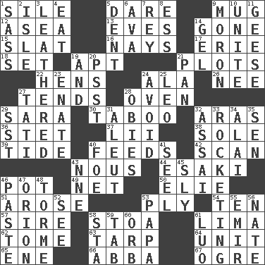 ACROSS 1. Drop; flow; fall 5. Have the gumption 9. Large cup 12. At sea 13. Nights before holidays 14. Went 15. Narrow board 16. Negative votes 17. 4th largest of the Great Lakes 18. Arrange properly for use 19. Fitting 21. Secret plans 22. Coop moms 24. Chicken ___ king 26. Born 27. Is inclined (to) 28. Baking chamber 29. "Two Mules for Sister ____" 30. Off limits 32. Ancient river in northeast Turkey 36. Proofreading order 37. Cards in a Roman deck? 38. Not divided or shared with others 39. Periodic rise and fall of the sea level 40. Gives food to 42. Skim 43. Common sense 44. 1973 Nobel Price Winner (Physics) Leo 46. Cooking vessel 49. Fish or hair follower 50. Writer Wiesel 51. Came up 53. Travel a route regularly 54. "___ Little Indians" 57. Male parent of an animal 58. Portico 61. Pale green bean 62. Heavy book 63. Canvas cover 64. A single undivided whole 65. Compass dir. 66. Swedish rock group 67. Legendary monster DOWN 1. Backtalk 2. Capri or Wright 3. Tough but pliablecoriaceous 4. Consume 5. Incision 6. Actress Gardner 7. Marina Del _, California 8. Double-curved letter 9. Person of subnormal intelligence 10. Join together 11. Honkers 14. Set 19. Also 20. Inconspicuous attention getter 21. Baking dish 23. Related on the mother's side 24. Shun 25. Lion 27. Jacques of French films 28. Off-Broadway awards 29. Fast jet (abbr.) 31. Native American of Southwest Alaska 32. Slender Brazilian palm 33. Shooting up abruptly 34. Jai ____ 35. Elected rep. 40. Enemy 41. Sew up the eyelids of hawks and falcons 43. Compass dir. 45. Stealthy 46. Thick mixture 47. Constellation of myth 48. Singer Mel 52. Observe 53. Dad 55. Arab leader 56. Nathan's nickname 58. R.R. building 59. Keyboard key 60. Globe 61. Nilotic language