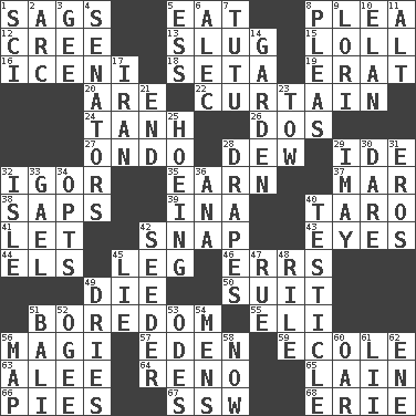 ACROSS 1. Droops 5. Ingest 8. Entreaty 12. Algonquian 13. Strike heavily 15. Hang loosely or laxly 16. Ancient Celtic tribe of eastern Britain 18. Stalk of a moss capsule 19. Part of Q.E.F. 20. "We ___ not amused" (Victoria) 22. Window treatment 24. Hyperbolic tangent 26. Two (Sp.) 27. Southwest Nigerian state 28. Morning condensation 29. Binary compound 32. Russian composer Stravinsky 35. Merit 37. Third mo. 38. Plant excrements 39. _ tizzy (2 wds.) 40. Edible starchy tuberous root 41. Allow 42. Fastener 43. Sight organs 44. Raised railways 45. Part of a journey 46. Blunders 49. Expire 50. Costume for a special activity 51. Mood resulting from idleness 55. Connecticut Ivy Leaguer 56. Wise men 57. Paradise 59. Learning spot: Fr. 63. Toward shelter 64. Former U.S. Attorney General Janet 65. (Had) reclined 66. Sliced desserts 67. Compass dir. 68. 4th largest of the Great Lakes DOWN 1. _-fi 2. Curve 3. Turn to the right 4. Elected representatives 5. Double-curved letter 6. Actor Baldwin 7. Ballerina skirt 8. Entreaties 9. Australian parrot (variant) 10. Flair 11. The first octave above the treble staff 14. Place where plants grow 17. SW Asia republic 21. Conclude 23. Pull behind 25. Weeding 28. Window treatments 29. "If ____ say so..." 30. Have the gumption 31. Greek god of love 32. Small island 33. Highlander 34. Elects 36. Santa ___, CA 40. One of the two male reproductive glands 42. Sowing specialist 45. Untruth 47. Sorrow 48. Cause heat under the collar 49. Frees from moisture 51. Indonesian resort city 52. Double curve, resembling the letter S 53. Lyric poems 54. Not women's 56. Atlas unit 58. At this time 60. Rowing implement 61. Cards in a Roman deck? 62. Compass dir.