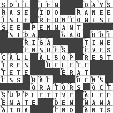 ACROSS 1. Earth 5. "___ Little Indians" 8. 24-hour periods 12. Raze (variant) 13. Wedding promise 14. The wife of a rajah (variant) 15. Capri or Wright 16. One who advocates reunion 19. Observe 20. Pre-World Series prize 21. Portico 23. E Mali city 24. Being at a high temperature 27. Port city in Latvia 30. Prong on a fork 31. Follows as a consequence or result 34. Nights before holidays 35. Give a ring to 38. Columnist Joseph or Stewart 40. Remainder 41. Angers 42. Erase 44. False hair 45. Part of Q.E.F. 46. Double-curved letter 47. Actress Charlotte 50. Cub Scout units 53. Speakers 57. Sep. follower 59. Supplementary 63. Toward shelter 64. Maternal 65. Lair 66. Grandmother 67. Opera by Verdi 68. Conclude 69. Pismires DOWN 1. Indian titles of respect 2. Fertile tracts in a desert 3. Small island 4. Area sheltered from the wind 5. Become fatigued 6. Locale of original sin 7. Part of speech 8. Daniel's nick name 9. Black tropical American cuckoo 10. Consenting reply 11. Put into a specified state 14. Printing process, for short 17. Tired old horse 18. _ tizzy (2 wds.) 20. Ache 22. Threatening words 24. Hub of activity 25. Washington bills 26. Trial 28. Girls' org. (abbr.) 29. Old (Scot.) 30. Cylindrical with tapered ends 32. Compass dir. 33. Not divided or shared with others 35. Quote 36. Ancient Greek god of war 37. Allows 39. For each 43. Small boys 47. Hero or heavy, e.g. 48. "We ___ not amused" (Victoria) 49. Ingest 51. Pitcher Ryan 52. Odor 54. Event that recurs at intervals 55. Baking chamber 56. Tear apart 58. Afternoon social gatherings 59. Ocean 60. University (slang) 61. Writing tablet 62. Parent Teacher Assoc. 63. Santa ___, CA