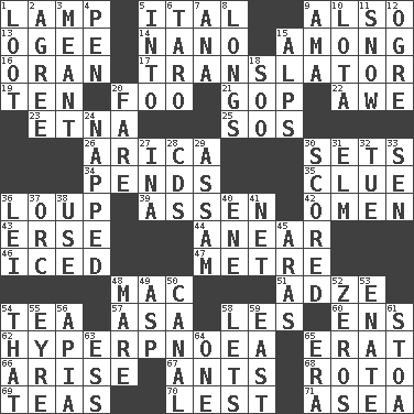 ACROSS 1. Desk light 5. Slanted text style (abbr.) 9. In addition 13. Double curve, resembling the letter S 14. Billionth: prefix 15. Amid 16. NW Algerian seaport 17. Interpreter 19. Nine, plus one 20. Egg _ yung 21. Republican Party 22. Deep reverence 23. Inactive volcano in Sicily 25. Mayday 26. N. Chile seaport 30. Puts into a specified state 34. Hangs 35. A slight indication 36. Central Nebraska county 39. NE Netherlands city 42. Presage 43. Celtic language 44. Approach 46. On the rocks 47. Distance measurement (Brit.) 48. Big _ 51. Axlike tool, used for shaping wood 54. Afternoon social gathering 57. White ___ sheet 58. French article 60. Followers of ems 62. Abnormally rapid or deep breathing 65. Part of Q.E.F. 66. Get up 67. Pismires 68. Printing process, for short 69. Beverages made from leaves 70. For fear that 71. At sea DOWN 1. Plunder 2. Match 3. Intended 4. Writing instrument 5. To the inside or interior of 6. Edible starchy tuberous root 7. Santa ___, CA 8. Yearns 9. Housemaid (var.) 10. Globular water bottle used in Asia 11. Overwhelm 12. Legendary monster 15. High mountains 18. "Barney Miller" actor Jack 20. Conductor's collection 24. Slept 27. _ tizzy (2 wds.) 28. Music discs 29. Indian state 30. Tallied 31. Shade tree 32. Third day of the wk. 33. Elected rep. 36. Flowery wreath 37. The grampus (Milton) 38. Purpose 40. Compass dir. 41. Fish or hair follower 45. Ancient river in northeast Turkey 48. Female horse 49. Cleo's killer 50. Lessep's creation 52. Nothings 53. Related on the mother's side 54. Not this but _ 55. Jane of fiction 56. Capital of Western Samoa 58. Allows 59. Compass direction 61. Portico 63. Curvy letter 64. Single 65. Epoch