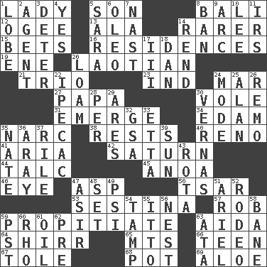 ACROSS 1. Kenny Rogers chart-topper in '80 5. Male child 8. Indonesian resort city 12. Double curve, resembling the letter S 13. Insect wing 14. Less widely known 15. Wagers 16. Dwellings 19. Compass dir. 20. Of or relating to Laos or its people 21. Musical group of three 23. Indiana (abbr.) 24. Spoil 27. Dad 30. Grand slam 31. Develop 34. Dutch treat 35. Drug cop 38. Musical pauses 40. Former U.S. Attorney General Janet 41. Operatic vocal solo 42. Titan orbits this 44. Baby powder 45. Small Philippine buffalo 46. Sight organ 47. Viper 50. Russian ruler of old 53. French poetic form 57. Director Reiner 59. Conciliate 63. Opera by Verdi 64. Bake eggs in their shells 65. Mountains (abbr.) 66. Adolescent 67. Lacquered or enameled metalware 68. Cooking vessel 69. _ vera DOWN 1. Ear part 2. Representative 3. Prevent from occurring 4. Affirmative reply 5. "Two Mules for Sister ____" 6. Butter sub 7. Political cartoonist Thomas 8. Forbid 9. Curve 10. Area sheltered from the wind 11. Big collection agency 14. Tear apart 17. One more than two 18. One of the 12 tribes of Israel 20. Rich soil 22. Medicinal drug used to evoke vomiting 24. Method 25. ____ Jay Lerner 26. San ____ (Riviera town) 28. For each 29. Ancient Greek god of war 30. Actresses Bloom and Felton 32. Girls' org. (abbr.) 33. Singer James 35. Nathan's nickname 36. Like ___ of sunshine 37. Cause heat under the collar 39. Player for Phoenix 43. Round or rotation of duties 47. SW Saudi Arabia district 48. Put into a specified state 49. 23rd letter of the Greek alphabet 51. Satellite of Uranus 52. Cowboy competition 54. Pack (down) 55. "Tell ____ the Marines!" 56. A home for chicks 58. Object of repulsion 59. Pacific Standard Time (abbr.) 60. 17th letter of the Greek alphabet 61. Petroleum 62. Before (prefix) 63. _ moment's notice (2 wds.)