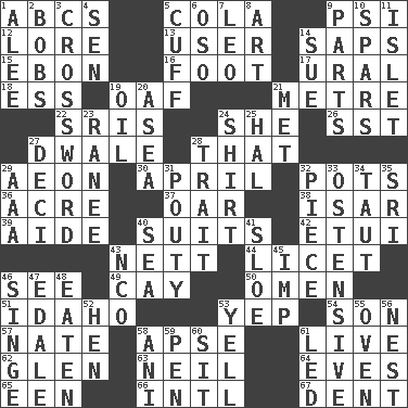 ACROSS 1. Lettered men learn these first 5. Root beer relative 9. Air pressure measure (abbr.) 12. Old wives' tales, e.g. 13. One who makes use of a thing 14. Plant excrements 15. Inky black, to poets 16. Lowest support of a structure 17. Mountain range 18. Curvy letter 19. Clumsy lout 21. Distance measurement (Brit.) 22. Indian titles of respect 24. A female animal or person 26. Fast jet (abbr.) 27. A sleeping potion; an opiate (poet.) 28. Not this but _ 29. Period of immesurable duration 30. Showery time 32. Plant holders 36. Measure of real estate 37. Rowing implement 38. Austrian river, tributary to the Danube 39. Assistant 40. Sets or collections 42. Needle case 43. Remaining after all deductions 44. It is permitted: Lat. 46. Perceive with the eye 49. Island 50. Sign of things to come 51. Potato state 53. Slangy assent 54. Male child 57. Nathan's nickname 58. Domed church section 61. Not recorded 62. Small, secluded valley 63. Famous astronaut Armstrong 64. Nights before holidays 65. Car or cant ending 66. International (abbr.) 67. Gouge DOWN 1. Toward shelter 2. Moves up and down 3. What you're doing now 4. Elected rep. 5. Sleeve end 6. Bear (Spanish) 7. Lion 8. Tate display 9. Actors' quests 10. Practice fights 11. Small island 14. Institute legal proceedings 19. Lubricate 20. Toward the sea 21. Was introduced to 23. Indian princess (variant) 24. Chest covering 25. Actor Linden 27. Tenth: prefix 28. Distinguishing feature 29. Auto club (abbr.) 31. Marked by pouting 32. Component 33. Clearly or manifestly demonstrative 34. Pulled tight 35. _ Lanka 40. Ocean 41. _ gin 43. Non-commissioned officer (abbr.) 45. Naughty child 46. Scorch 47. Peak District village in England 48. Ingested 52. Layer 53. Shout 55. Baking chamber 56. A home for chicks 58. Black tropical American cuckoo 59. Animal enclosure 60. Be seated 61. Directed
