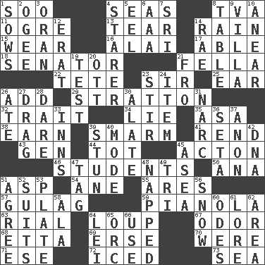 ACROSS 1. "Barney Miller" actor Jack 4. Oceans 8. Federal power corp. 11. Legendary monster 13. Separate forcefully 14. Water falling in drops from the sky 15. Put on (as clothing) 16. Jai ____ 17. Competent 18. Legislator 21. Chap (slang) 22. False hair 23. Title for a knight 25. Hearing organ 26. Increase 29. Ski resort town in Vermont 32. Distinguishing feature 34. Falsehood 35. White ___ sheet 38. Merit 39. Excessive but superficial compliments 41. Tear apart 43. Commissioned mil. rank 44. Small child 45. 13-14th century defensive garment 46. SAT takers 50. Santa ___, CA 51. Cleo's killer 54. One (Scot) 55. Ancient Greek god of war 57. POW camp 59. Player piano 63. Monetary unit of Yemen 64. Central Nebraska county 67. Scent 68. Singer James 69. Celtic language 70. We are 71. Compass dir. 72. On the rocks 73. Ocean DOWN 1. Sty mamas 2. Double curve, resembling the letter S 3. NW Algerian seaport 4. A viewer who gazes fixedly 5. Snakelike fish 6. Auto club (abbr.) 7. _ Lanka 8. Eating place 9. Country estate 10. Approach 12. Part of Q.E.F. 14. Actress Charlotte 19. Trial 20. Baseball player Mel 21. From 23. Move through with a circular motion 24. A whole individual unit 26. Had dinner 27. To trail on the ground 28. Have the gumption 30. Having winglike extensions 31. Drug cop 33. Restaurants 36. Stalk of a moss capsule 37. At once, immediately (arch.) 39. Surprise greatly 40. Method 42. Heredity factor (abbr.) 45. At sea 47. Label 48. Slept 49. Three (prefix) 51. Match 52. Costumes for special activities 53. Food holder 56. Frozen precipitation 58. Insect wing 60. Lyric poems 61. Old wives' tales, e.g. 62. Type of rug 64. Flowery wreath 65. The grampus (Milton) 66. Purpose