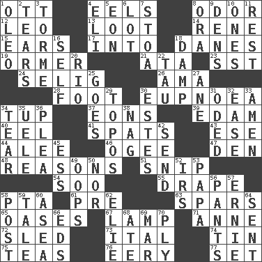 ACROSS 1. Baseball player Mel 4. Snakelike fish 8. Scent 12. Lion 13. Plunder 14. French philosopher Descartes 15. Hearing organs 17. To the inside or interior of 18. Natives or inhabitants of Denmark 19. Channel Islands abalone 21. _ moment's notice (2 wds.) 23. Fast jet (abbr.) 24. Former Milwaukee Brewers owner Bud 26. Nanny (var.) 28. One third of a yard 30. Normal relaxed breathing 34. Uncastrated adult male sheep 37. Immeasurably long periods of time 39. Dutch treat 40. Snakelike fish 41. Arguments over trivial matters 43. Compass dir. 44. Toward shelter 46. Double curve, resembling the letter S 47. Lair 48. Thinks logically 51. Sever or remove by pinching or nipping 54. "Barney Miller" actor Jack 55. Window treatment 58. Parent Teacher Association (abbr.) 61. Before (prefix) 63. Practice fights 65. Fertile tracts in a desert 67. Desk light 71. Queen of England 1702-14 72. Downhill vehicle 73. Slanted text style (abbr.) 74. Metal container 75. Afternoon social gatherings 76. Suggestive of the supernatural 77. Arrange properly for use DOWN 1. Margarine 2. Rends 3. Singer Mel 4. Connecticut Ivy Leaguer 5. Age 6. Car dealer's back yard 7. Portico 8. Mouth or opening 9. Hiding places for outlaws 10. Singles 11. Take ten 16. Itself 18. Moist 20. River (Sp.) 22. The 19th letter of the Greek alphabet 25. Moves 27. One (Scot) 29. Literary convention 30. _____ Park, CO 31. Wrote a lyric poem 32. Relaxation 33. So be it 34. Lacerate 35. Ubangi River tributary 36. Entreaty 38. Tired old horse 42. Transmit 45. Double-curved letter 49. I made a mistake 50. Not either 52. Big collection agency 53. Dad 56. Leg coverings 57. Bert's buddy 58. Mail 59. Story 60. At sea 62. Writer Wiesel 64. Posted 66. Begley and Asner 68. Had dinner 69. Third mo. 70. Strand of rope, yarn or thread