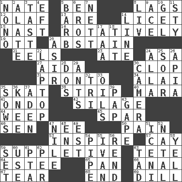 ACROSS 1. Nathan's nickname 5. Benjamin's nick name 8. Fails to keep up a pace 12. Norwegian king 13. "We ___ not amused" (Victoria) 14. It is permitted: Lat. 15. Political cartoonist Thomas 16. Happening in regular succession 19. Baseball player Mel 20. Choose not to consume 21. Snakelike fish 23. Had dinner 24. White ___ sheet 27. Opera by Verdi 30. Hoof sound 31. Right away 34. Jai ____ 35. Three-handed card game 38. Long narrow piece of something 40. Hindu Mythology: god of death 41. Southwest Nigerian state 42. Fodder prepared in a silo 44. Shed a tear 45. Coast Guard woman 46. Elected rep. 47. Born 50. Ache 53. Motivate 57. Island 59. Supplying deficiencies 63. False hair 64. First name in cosmetics 65. Baking dish 66. Of or related to the anus 67. Separate forcefully 68. Conclude 69. Deli pickle DOWN 1. Words to Nanette 2. Having winglike extensions 3. Clothes sense 4. Newt 5. Sharp remark 6. Greek god of love 7. Remaining after all deductions 8. 54 in ancient Rome 9. Adept person 10. Set 11. Filthy place 14. Actor's bit 17. Auto club (abbr.) 18. Teat (slang) 20. SW Saudi Arabia district 22. Portable computer 24. Silent film actress Nazimova 25. Fly high 26. Capital of Western Samoa 28. Two (Sp.) 29. Pismires 30. Device for capturing images 32. Three (prefix) 33. Lubricates 35. Sty mamas 36. Leg joint 37. Arabian gulf 39. Infant food 43. Open wide 47. "Death on the ____" 48. Compass dir. 49. Eastern Standard Time (abbr.) 51. Ancient Celtic tribe of eastern Britain 52. Brizilian seaport 54. Corncob 55. _ the terrible 56. Tear apart 58. Shout 59. Put into a specified state 60. Purpose 61. Parent Teacher Assoc. 62. For each 63. Small amount or degree