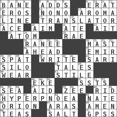 ACROSS 1. Object of repulsion 5. Does sums 9. Part of Q.E.F. 13. Greek god of love 14. Words to Nanette 15. Odor 16. Actor's bit 17. Interpreter 19. Adept person 20. Direct toward a target or goal 21. Had dinner 22. Small island 23. Smallest unit of an element 25. Actress Charlotte 26. Indian princess (variant) 30. Vertical spar for supporting sails 34. Having the leading position 35. Independent ruler or chieftain 36. Petty quarrel 39. Compose 42. Indian skirt 43. Grain storage tower 44. Lies 46. Erode 47. Vertical member of a panel or frame 48. Make supply last 51. Fast planes 54. Ocean 57. Help 58. Last letter of the English alphabet 60. To free from 62. Abnormally rapid or deep breathing 65. Nathan's nickname 66. Greek mythologigal hunter 67. Caspian sea tributary 68. So be it 69. Beverages made from leaves 70. Table seasoning 71. Global Positioning Systems (abbr.) DOWN 1. Actor Lugosi 2. N. Chile seaport 3. Music written for nine 4. Compass dir. 5. Opposed to 6. Dormintory (informal) 7. Heredity factor (abbr.) 8. Echolocation 9. Epoch 10. Round or rotation of duties 11. Mine, in Marseilles 12. Small pie 15. Toward shelter 18. R.R. building 20. Nanny 24. Speaker 27. ___ Haven, CT 28. Hearing organ 29. Prepares for publication 30. Makes clutter 31. Nanny (var.) 32. Title for a knight 33. Three (prefix) 36. Compass dir. 37. Sliced dessert 38. According to 40. Make lace 41. Biblical high priest 45. Otherwise 48. Merit 49. Sleep 50. Ferber et al. 52. _____ steamer (cargo ship) 53. Locates 54. Went for two points 55. Jane of fiction 56. Capital of Western Samoa 58. Ardor 59. 90 degrees 61. Cub Scout units 63. Greek goddess of the dawn 64. Mouth or opening 65. Tired old horse