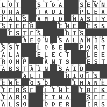 ACROSS 1. Car dealer's back yard 4. Portico 8. Stitched 12. Mouth or opening 13. "Change" in Tahitian 14. Entreaty 15. Friends 17. Among 18. Smutty 19. Bull 21. Compass dir. 23. Curvy letter 24. _____ Park, CO 26. Again 28. Age 30. Deli grouping 34. Fast jet (abbr.) 37. Ear part 39. Sweet dark-red dessert wine 40. Wing 41. Voters do this 43. Area sheltered from the wind 44. Frolic 46. Pismires 47. Eastern Standard Time (abbr.) 48. Refrain by choice 51. Expressed in words 54. The first octave above the treble staff 55. Disturbances 58. She-sheep 61. Bear (Spanish) 63. Lacking in sense or substance 65. Laconic 67. Actor's bit 71. Long journey 72. Edible starchy tuberous root 73. Inactive volcano in Sicily 74. Observe 75. In addition 76. River in Europe 77. Big collection agency DOWN 1. Chops off 2. Declaim 3. Lies 4. R.R. building 5. Scottish cap 6. Fr. "Yes" 7. Helper 8. Health resort 9. Otherwise 10. Soaks 11. Negative votes 16. Bristle 18. Famous astronaut Armstrong 20. To separate or throw off 22. Basketball assoc. 25. Flatfish 27. Plant excrement 29. Pitcher Ryan 30. Religious groups 31. Undercover agent 32. Angers 33. Proofreading order 34. "Two Mules for Sister ____" 35. Oscar Madison type 36. Scottish caps 38. Benjamin's nick name 42. Russian ruler of old 45. Parent Teacher Assoc. 49. Medicinal plant 50. It is 52. One more than two 53. Do not 56. Tarsus (plural) 57. Contemptuous expression 58. Singer James 59. Welt 60. Blunders 62. Margarine 64. Supplements with great effort 66. "Barney Miller" actor Jack 68. It would 69. Compass dir. 70. Ewer handle