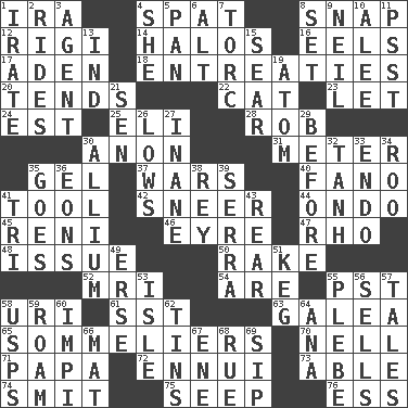 ACROSS 1. Lyricist Gershwin 4. Petty quarrel 8. Fastener 12. Swiss mountan, "Queen of the Mountains" 14. Saint headwear 16. Snakelike fish 17. An important port of Yemen 18. Pleas 20. Looks after 22. Feline 23. Allow 24. Eastern Standard Time (abbr.) 25. Biblical high priest 28. Director Reiner 30. At once, immediately (arch.) 31. Distance measurement 35. Set 37. Armed conflicts 40. Papal veil 41. Instrument 42. Scornful expression 44. Southwest Nigerian state 45. Painter Guido (1575-1642) 46. Jane of fiction 47. 17th letter of the Greek alphabet 48. Come out of 50. Libertine 52. Medical imaging device (abbr.) 54. "We ___ not amused" (Victoria) 55. Pacific Standard Time (abbr.) 58. RI univ. 61. Fast jet (abbr.) 63. An organ shaped like a helmet 65. Wine waiters 70. 1994 drama film starring Jodie Foster 71. Dad 72. World-weariness 73. Competent 74. Stricken, poetically 75. Ooze 76. Double-curved letter DOWN 1. Feeling or showing extreme anger 2. Amusement-park features 3. Rep 4. A female animal or person 5. Baking dish 6. Keyboard modifier key 7. Torque (variant) 8. Put into a specified state 9. Famous astronaut Armstrong 10. Toward shelter 11. Inconspicuous attention getter 13. Working for oneself (abbr.) 15. Wither 19. Smallest unit of an element 21. Elected rep. 26. Coldest temperatures 27. Silly 29. Prior to 30. Plant genus of onion and garlic 32. Hyperbolic tangent 33. Inside; within (prefix) 34. Friend of Pooh 35. Travels 36. Immeasurably long periods of time 38. Marina Del _, California 39. Spanish missionary in California 41. Three (prefix) 43. Buttocks 49. Celtic language 51. Barrel 53. Capri or Wright 55. Military trainee 56. Exchanges for money 57. Falsehoods 58. United States Postal Service (abbr.) 59. Wander aimlessly 60. Body of Kaffir warriors 62. Metal containers 64. Santa ___, CA 66. Floor protector 67. Compass dir. 68. Sorrow 69. Small drink