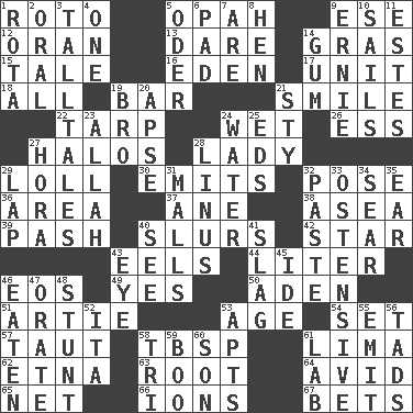 ACROSS 1. Printing process, for short 5. Brightly colored fish 9. Compass dir. 12. NW Algerian seaport 13. Have the gumption 14. Pate de foie ____ 15. Lie 16. Locale of original sin 17. A single undivided whole 18. 100% 19. Tavern 21. Grin 22. Canvas cover 24. Dripping 26. Curvy letter 27. Rings 28. Kenny Rogers chart-topper in '80 29. Hang loosely or laxly 30. Gives off 32. Airs 36. Type of rug 37. A saturated hydrocarbon 38. Toward the sea 39. Romantic infatuation 40. Plays smoothly or legato 42. Play the lead 43. Snakelike fish 44. 61 cubic inches 46. Greek goddess of the dawn 49. Affirmative reply 50. Arabian gulf 51. Nick name for Arthur 53. Mature 54. Arrange properly for use 57. Tense 58. Cook's measure (abbr.) 61. Pale green bean 62. Inactive volcano in Sicily 63. Carrot, for example 64. Enthusiastic 65. Fish or hair follower 66. Charged particles 67. Wagers DOWN 1. Round or rotation of duties 2. Taken by mouth 3. Baron Munchausen's specialties 4. Single 5. Baltic tributary 6. Groovy apt. 7. "We ___ not amused" (Victoria) 8. Layer 9. Bert's buddy 10. Moves on water 11. _____ Park, CO 14. Chewing product 19. Sis' sibling 20. Domed church section 21. Filthy place 23. Assad's deity 24. Wetness 25. Begley and Asner 27. Israeli folk dance 28. "_ and Lucy" (Charlie Brown theme song) 29. Pet locale 31. Shopping centers 32. Thick mixture 33. Clearly or manifestly demonstrative 34. Wither 35. Hearing organ 40. Perceive with the eye 41. Volcanic refuse 43. Sight organ 45. Binary compound 46. Consumed 47. Declaim 48. Difficult or unusual or dangerous feat 52. Call ___ day 53. Flats, for short 55. Send forth 56. Small amounts or degrees 58. Three (prefix) 59. Oct. 31 cry 60. Manchild 61. Experiment locale