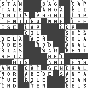 ACROSS 1. Comedian Laurel of Laurel & Hardy 5. Paper or plastic container 8. Head covering 11. Lie 12. Small Philippine buffalo 14. Connecticut Ivy Leaguer 15. Leaves out 17. Move like a hungry wolf 18. Chop off 19. Small, flat, pigmented spot on the skin 21. Compass dir. 22. Area sheltered from the wind 23. Compass dir. 24. Pet locale 25. Police officer (slang) 27. Petroleum 28. "______ My Girl" (Turtles hit) 31. Actor Lugosi 35. Direct toward a target or goal 37. Root beer relative 38. Lyric poems 39. Allow head to fall sleepily 41. Of or related to the anus 42. Prejudice 43. Armed conflict 45. Monthly bill 46. Stalk of a moss capsule 47. Was introduced to 49. Part of HMS, perhaps 51. Cuckoo 52. Followers of ems 55. One (Scot) 57. Clumsy lout 60. Commissioned military rank 62. Or not 63. Remain 65. Before Barbara or Clara 66. Third day of the wk. 67. Cause heat under the collar 68. Thailand, formerly 69. Working for oneself (abbr.) 70. Nine, plus one 71. Snakelike fish DOWN 1. Took without asking 2. Softens 3. Place in a line 4. Remaining after all deductions 5. Oblong piece of solid material 6. Soon (poet.) 7. Long dress 8. Portable communications device 9. _ vera 10. Corncob 13. Actor Baldwin 16. Grain storage tower 17. Cotton for raincoats, e.g. 20. Greek goddess of the earth (variant) 26. Motion picture award 29. Liveliness 30. Table seasoning 31. Moves up and down 32. Singer Brickell 33. Resembling or made to resemble leather 34. Slender Brazilian palm 36. Cut the grass 40. Break 44. French philosopher Descartes 48. Metal containers 50. Fly high 52. Bert's buddy 53. Brizilian seaport 54. Shuts with force 55. Against 56. Part of speech 58. "This won't hurt ____!" 59. Do some clerical work 61. Relaxation 64. Lair