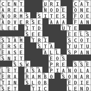 ACROSS 1. Penny 5. RI univ. 8. Domesticated feline 11. Type of rug 12. Thickened enlargement 14. Single 15. Typical models 17. Locates 18. Enemy 19. Contrary to your interests or welfare 21. American Automobile Association (abbr.) 22. Avid follower 23. Area sheltered from the wind 24. It would 25. Shoshoni 27. Perceive with the eye 28. Snakelike fish 31. Thailand, formerly 35. Three (prefix) 37. Native of Scotland 38. Celtic language 39. R.R. building 41. Ballerina skirt 42. Relaxation 43. Everything 45. Connect, as a bridge 46. In a ____ (agitated or irritated) 47. Greek goddess of the dawn 49. Compass dir. 51. Before (prefix) 52. Compass dir. 55. Allow 57. White ___ sheet 60. Player piano 62. Period 63. Role for Stallone 65. Echolocation 66. Shallow baking pan 67. Messy guy 68. Singer Brickell 69. Arrange properly for use 70. Nervous spasm 71. Grant temporary use of DOWN 1. Lessep's creation 2. Eat (away) 3. Boldness 4. Not wild 5. Single; one (prefix) 6. Roll call or roster of names 7. The content of cognition 8. Java holder (2 wds.) 9. Small Philippine buffalo 10. Adolescent 13. Son of Isaac 16. Indian titles of respect 17. Spring feasts 20. Proofreading order 26. Trials 29. Globular water bottle used in Asia 30. Astound 31. Perceives with the eye 32. SW Asia republic 33. Helper 34. Confronts 36. Call ___ day 40. City in Syria 44. Australian parrot (variant) 48. Oceans 50. Armed conflicts 52. Something which is sent 53. Killed 54. Having ears or earlike features 55. Allows 56. 4th largest of the Great Lakes 58. Table seasoning 59. Mine, in Marseilles 61. Christmas carol 64. English channel?