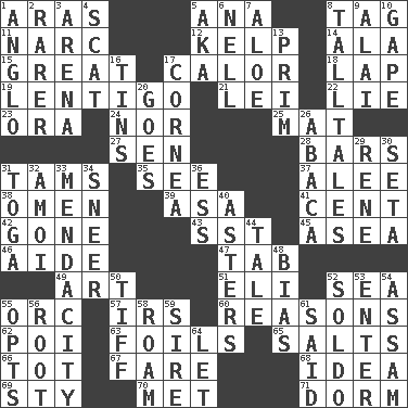 ACROSS 1. Caspian sea tributary 5. Santa ___, CA 8. Label 11. Drug cop 12. Seaweed 14. Wing 15. Relatively large 17. Bodily heat indicating an inflammation 18. Pet locale 19. Small, flat, pigmented spot on the skin 21. Flowery wreath 22. Falsehood 23. Mouth or opening 24. And not 25. Floor protector 27. Elected rep. 28. Taverns 31. Scottish caps 35. Perceive with the eye 37. Toward shelter 38. Presage 39. White ___ sheet 41. Penny 42. Went 43. Fast jet (abbr.) 45. Toward the sea 46. Assistant 47. Keyboard key 49. Nonscientific branch of learning 51. Biblical high priest 52. Ocean 55. The grampus (Milton) 57. Big collection agency 60. Thinks logically 62. Luau course 63. Fencing necessities 65. Table seasonings 66. Small child 67. Conductor's collection 68. It may be bright or harebrained 69. Filthy place 70. Was introduced to 71. Dormintory (informal) DOWN 1. White American of non-Hispanic descent 2. Less widely known 3. Sports stadium 4. Get outta here! 5. Alias (abbr.) 6. 1994 drama film starring Jodie Foster 7. _ vera 8. Baron Munchausen's specialties 9. Jai ____ 10. Open wide 13. Demure 16. Canisters 17. Pupil covering 20. Moves 26. Phillipine bananalike plant 29. French philosopher Descartes 30. Bristle 31. Ancient Roman robe 32. Mine, in Marseilles 33. Ananias' fault 34. Contemptuous expression 36. Curvy letter 40. Michaelmas daisies 44. Story 48. Prejudice 50. Small quarrel 52. Twentieth part of a lira 53. Keyboard key 54. Indian state 55. Chooses 56. Carrot, for example 58. Wander aimlessly 59. The founder of a family 61. Stated 64. Allow