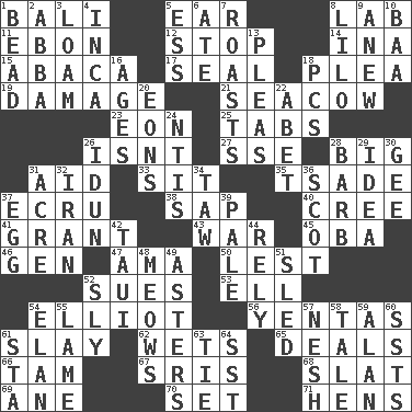 ACROSS 1. Indonesian resort city 5. Ewer handle 8. Experiment locale 11. Inky black, to poets 12. Cease 14. _ tizzy (2 wds.) 15. Phillipine bananalike plant 17. Lick closed 18. Entreaty 19. Break 21. Manatee 23. Age 25. Bar bills 26. Is not 27. Compass dir. 28. Of large size 31. Assist 33. Be seated 35. Sadhe (variant) 37. Shade of tan 38. Plant excrement 40. Algonquian 41. Monetary aid 43. Armed conflict 45. Chief or king in Benin or Nigeria 46. Commissioned military rank (abbr.) 47. Nanny (var.) 50. For fear that 52. Institutes legal proceedings 53. Pipe bend 54. American author Paul (1891-1958) 56. Gossips 61. Kill 62. Moistens 65. Allots cards 66. Scottish cap 67. Indian titles of respect 68. Narrow board 69. A saturated hydrocarbon 70. Arrange properly for use 71. Coop moms DOWN 1. Necklace unit 2. Swedish rock group 3. Rich soil 4. South American Indian 5. Curvy letter 6. Had dinner 7. Cooks with dry heat, as in an oven 8. _ and Stitch 9. Afresh 10. Sound made by sheep 13. Entreaties 16. Ripens 18. Personal Computers (abbr.) 20. Immeasurably long periods of time 22. Collude with 24. Nuclear Threat Initiatives 26. Goddess of spring and wife of Bragi 28. Sharp remark 29. The content of cognition 30. Unit of force equal to gravity 31. 1/640 square mile 32. SW Asia republic 34. The 23rd letter of the Hebrew alphabet 36. Highlander 37. Oval reproductive body of a fowl 39. Diluted with white 42. "Change" in Tahitian 44. Depend 48. Catcalls? 49. Michaelmas daisies 51. Downhill vehicle 52. Stealthy 54. Flair 55. Unable to walk 57. Tender 58. Lie 59. ____ Jay Lerner 60. Fast planes 61. R.R. building 63. Standoff 64. Fast jet (abbr.)