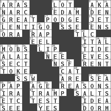 ACROSS 1. Caspian sea tributary 5. Car dealer's back yard 8. Alias (abbr.) 11. Drug cop 12. Dutch treat 14. Lair 15. Relatively large 17. Plash 18. _ stream 19. Small, flat, pigmented spot on the skin 21. Compass dir. 22. Followers of ems 23. Mouth or opening 24. Hit sharply and swiftly 25. Affectionate concern, for short 27. Snakelike fish 28. Slanted text style (abbr.) 31. Crowds into 35. Mouth edge 37. Event that recurs at intervals 38. Jai _ 39. Born 41. Nights before holidays 42. Religious group 43. Science/research agcy. 45. Monthly bill 46. Puff or smoke 47. Domesticated feline 49. Compass dir. 51. "We ___ not amused" (Victoria) 52. Ocean 55. Infant food 57. Ripen 60. Thinks logically 62. Retirement account (abbr.) 63. _____ steamer (cargo ship) 65. Table seasonings 66. And so on (abbr.) 67. Trial 68. The content of cognition 69. Observe 70. Consenting reply 71. Dormintory (informal) DOWN 1. White American of non-Hispanic descent 2. More valued for its uncommonness 3. Sports stadium 4. Scram! 5. Lion 6. Probability 7. Labels 8. Descriptive word 9. Peachy ____! 10. Pismires 13. Rendezvous 16. Hoop that covers a wheel 17. Cotton for raincoats, e.g. 20. Highlander 26. 61 cubic inches 29. Arabian gulf 30. For fear that 31. Vertical spar for supporting sails 32. Margarine 33. Keyboard key 34. Settings 36. Writing instrument 40. Fortification 44. Conductor's collection 48. Beverages made from leaves 50. Electrical Unit 52. Twentieth part of a lira 53. Keyboard key 54. Indian state 55. Sliced desserts 56. Johnson of "Laugh-In" 58. Jennifer or Joel 59. Comfort 61. Expressed in words 64. Mountains (abbr.)