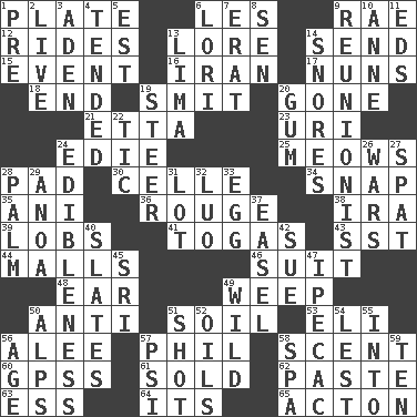 ACROSS 1. Food holder 6. French article 9. Actress Charlotte 12. Amusement-park features 13. Old wives' tales, e.g. 14. Post 15. Happening 16. SW Asia republic 17. Religious women 18. Conclude 19. Stricken, poetically 20. Went 21. Singer James 23. RI univ. 24. Singer Brickell 25. Catcalls? 28. Writing tablet 30. Cell (Danish) 34. Fastener 35. Cuckoo 36. Makeup applied to the cheeks 38. Lyricist Gershwin 39. Tennis shots 41. Ancient Roman robes 43. Fast jet (abbr.) 44. Promenades 46. Set or collection 48. Ewer handle 49. Shed a tear 50. Against 51. Earth 53. Biblical high priest 56. Toward shelter 57. Silvers or Donahue 58. Aroma 60. Global Positioning Systems (abbr.) 61. Disposed of to a purchaser 62. Thick mixture 63. Double-curved letter 64. It is 65. Gambison DOWN 1. Before (prefix) 2. Not recorded 3. An important port of Yemen 4. Looked after 5. Eastern Standard Time (abbr.) 6. Australian parrot (variant) 7. Part of Q.E.F. 8. Elected rep. 9. One who advocates reunion 10. Singer Murray 11. Begley and Asner 13. Pale green bean 14. Sounds asleep 19. Guide 20. Chewing product 22. Nervous spasm 24. The property of being fit to eat 26. Armed conflicts 27. Petty quarrel 28. Inside of hand 29. Small Philippine buffalo 31. Car dealer's back yard 32. Nilotic language 33. Ovum 37. Artist's stand 40. Chalkboards 42. Take to court 45. Indian title of respect (Mr.) 47. Medicinal drug used to evoke vomiting 49. Uncontrolled 50. High mountains 51. Opportunity 52. Petroleums 54. For fear that 55. To the inside or interior of 56. Grow older 57. 23rd letter of the Greek alphabet 58. Health resort 59. "___ Little Indians"