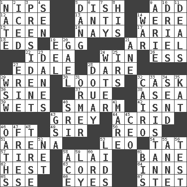 ACROSS 1. Pinches, bites 5. Food container 9. Increase 12. 43,560 square feet 13. Against 14. Past tense of be (plural) 15. Adolescent 16. Negative votes 17. Roberta Peters solo 18. Begley and Asner 19. Ovum 21. Satellite of Uranus 22. It may be bright or harebrained 24. Acquire through effort 26. Double-curved letter 27. Peak District village in England 28. Have the gumption 29. Songbird 30. Plunders 32. Keg 36. Trig term 37. Regret 38. Toward the sea 39. Moistens 40. Excessive but superficial compliments 42. Is not 43. Jennifer or Joel 44. Bitter 46. Often (poetically) 49. Title for a knight 50. Vintage cars 51. Sports stadium 53. Lion 54. Make lace 57. Become fatigued 58. Jai ____ 61. Object of repulsion 62. Command 63. Drawstring 64. Restaurants 65. Compass dir. 66. Sight organs 67. Proofreading order DOWN 1. Nathan's nickname 2. On the rocks 3. Elected leader of a country 4. Elected rep. 5. Mild oath, euphamism for damn 6. _ tizzy (2 wds.) 7. Filthy place 8. Part of HMS, perhaps 9. Nest on high 10. Frees from moisture 11. Allots cards 14. Armed conflict 19. Snakelike fish 20. Highlander 21. One (Scot) 23. Natives or inhabitants of Denmark 24. Wetness 25. Big collection agency 27. 4th largest of the Great Lakes 28. A city in N France, SE of Calais 29. Compass dir. 31. Abalone 32. Capital of Egypt 33. Aide 34. Post 35. Krazy ___ of comics 40. _ Lanka 41. Female horse 43. Girls' org. (abbr.) 45. Corporate head (abbr.) 46. Expletives 47. Strips of potato fried in deep fat 48. Laconic 52. Fish or hair follower 53. Hats (slang) 55. Queen of England 1702-14 56. Trial 58. Adept person 59. Myrna of the movies 60. "We ___ not amused" (Victoria) 61. Twice