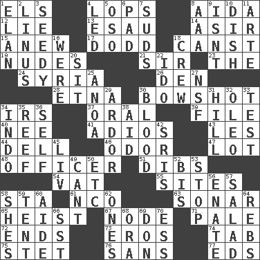 ACROSS 1. Raised railways 4. Chops off 8. Opera by Verdi 12. Whopper 13. He sold his birthright 14. SW Saudi Arabia district 15. Afresh 17. Texas town _ City 18. 2nd pers. sing. pres. of can (arch.) 19. Unadorned figures 21. Title for a knight 23. Definite Article 24. Damascus' land 26. Lair 28. Inactive volcano in Sicily 30. The distance a bow sends an arrow 34. Big collection agency 37. Of the mouth 39. Do some clerical work 40. Born 41. Goodbye (Sp.) 43. French article 44. Small valley 46. Aroma 47. Car dealer's back yard 48. Person of authority 51. Rights 54. Large container 55. Settings 58. R.R. building 61. Non-commissioned officer (abbr.) 63. Underwater navigation system 65. Robbery 67. Connecting point 71. Diluted with white 72. Conclusions 73. Greek god of love 74. Keyboard key 75. Proofreading order 76. Without 77. Begley and Asner DOWN 1. Liveliness 2. "_ and Lucy" (Charlie Brown theme song) 3. Full of seeds 4. Directed 5. Bear (Spanish) 6. Writing tablet 7. Soap bubbles 8. American Automobile Association (abbr.) 9. Is not 10. Food container 11. Johnson of "Laugh-In" 16. We are 18. Ship's personnel 20. Be seated 22. Wedding promise 25. Small Philippine buffalo 27. Science/research agcy. 29. Zeal 30. Vital fluid 31. Land elevation 32. Butter sub 33. Trial 34. Southeast Asian peninsula 35. Coral ridge 36. Itself 38. Assist 42. Indian titles of respect 45. 54 in ancient Rome 49. Patter 50. And so on (abbr.) 52. Twice 53. Obstruct or block passage 56. Maternal 57. First course 58. "______ My Girl" (Turtles hit) 59. Portable shelter 60. Helper 62. Washington bills 64. Confederate soldiers (slang) 66. Fast jet (abbr.) 68. Mouth or opening 69. Spanish title 70. Double-curved letter