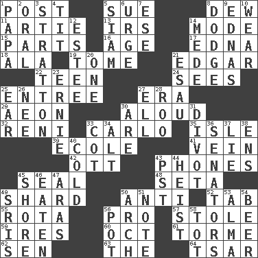 ACROSS 1. Mail 5. Take to court 8. Morning condensation 11. Nick name for Arthur 13. Big collection agency 14. Method 15. Components 16. Grow older 17. Pulitzer Prize-winning author Ferber 18. Insect wing 19. Heavy book 21. _ Allan Poe 22. Adolescent 24. Perceives with the eye 25. Main course 27. Epoch 29. A really long time 30. Verbally 32. Painter Guido (1575-1642) 33. Monte _, Las Vegas Hotel/Casino 35. Small island 39. Learning spot: Fr. 41. Distinctive style or manner 42. Baseball player Mel 43. Gives a jingle 45. Lick closed 48. Stalk of a moss capsule 49. Broken piece 50. Against 52. Bar bill 55. Roll call or roster of names 56. Adept person 57. Took without asking 59. Angers 60. Sep. follower 61. Singer Mel 62. Elected rep. 63. Definite Article 64. Russian ruler of old DOWN 1. Dad 2. Relating to the mouth 3. Ski resort town in Vermont 4. Teat (slang) 5. Thailand, formerly 6. Goad 7. Compass dir. 8. Evade 9. Ferber et al. 10. Put on (as clothing) 12. First name in cosmetics 14. Ancient Persian 20. Single 21. Son of Isaac 23. Bert's buddy 25. Ewer handle 26. Born 27. Pipe bend 28. Friend of Pooh 30. "We ___ not amused" (Victoria) 31. A piece of turf (Scot.) 33. Small bed 34. The first octave above the treble staff 36. Elected representatives 37. Untruth 38. Followers of ems 40. Chilled 43. Pacific Standard Time (abbr.) 44. Robbery 45. Dinah or Pauly 46. Eroded 47. Ancient river in northeast Turkey 49. Indian titles of respect 50. Bowlike part 51. Musical sound 53. _ mater 54. Fermented drink made from hops 56. Cooking vessel 58. Small child