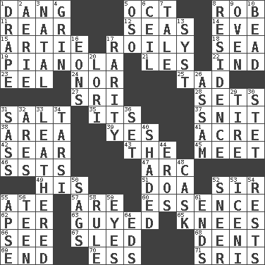 ACROSS 1. Mild oath, euphamism for damn 5. Sep. follower 8. Director Reiner 11. Hitchcock's "____ Window" 12. Oceans 14. First lady 15. Nick name for Arthur 17. Agitated, as a liquid 18. Ocean 19. Player piano 21. French article 22. Working for oneself (abbr.) 23. Snakelike fish 24. Not either 25. Bit 27. Indian title of respect (Mr.) 28. Arranges properly for use 31. Table seasoning 35. ___ a Wonderful Life 37. In a ____ (agitated or irritated) 38. Type of rug 39. Consenting reply 41. 43,560 square feet 42. Singe 43. Definite Article 45. Confront 46. Fast planes 47. Curve 49. Part of HMS, perhaps 51. ___ good deed 52. Title for a knight 55. Had dinner 57. "We ___ not amused" (Victoria) 60. Gist 62. For each 63. Mocked 65. Leg joints 66. Observe 67. Downhill vehicle 68. Incision 69. Conclusion 70. Double-curved letter 71. Indian titles of respect DOWN 1. Window treatment 2. Nest on high 3. Brizilian seaport 4. Smile widely 5. Bear (Spanish) 6. To provide with a ceiling 7. Story 8. Home 9. Baking chamber 10. Necklace unit 13. System (abbr.) 16. Immeasurably long periods of time 17. Noteworthy scarcity 20. Australian parrot (variant) 26. Indian state 29. Become fatigued 30. Proofreading order 31. Backtalk 32. Ancient Greek god of war 33. Tough but pliablecoriaceous 34. Tarsus (plural) 36. Arrange properly for use 40. Cast a shadow over 44. Greek god of love 48. Keg 50. Droops 52. Contemptuous expression 53. Ancient Celtic tribe of eastern Britain 54. Musical pauses 55. Domed church section 56. Adolescent 58. Governing power 59. Snake ____ (dice throw) 61. Extremities 64. Begley and Asner