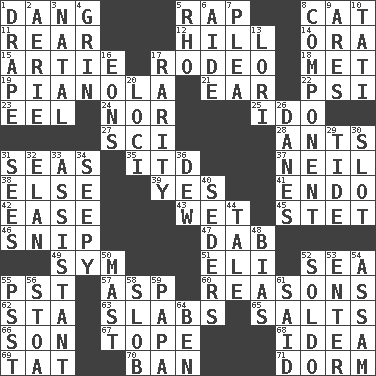 ACROSS 1. Mild oath, euphamism for damn 5. Hit sharply and swiftly 8. Feline 11. Bring up, as a child 12. Land elevation 14. Mouth or opening 15. Nick name for Arthur 17. Cowboy competition 18. Was introduced to 19. Player piano 21. Ewer handle 22. 23rd letter of the Greek alphabet 23. Snakelike fish 24. Not either 25. Wedding promise 27. _-fi 28. Pismires 31. Oceans 35. It would 37. Famous astronaut Armstrong 38. Otherwise 39. Consenting reply 41. Inside; within (prefix) 42. Comfort 43. Soggy 45. Proofreading order 46. Sever or remove by pinching or nipping 47. Pat or tap gently 49. Symbol (abbr.) 51. Connecticut Ivy Leaguer 52. Ocean 55. Pacific Standard Time (abbr.) 57. Viper 60. Thinks logically 62. R.R. building 63. Broad, flat, thick pieces 65. Table seasonings 66. Male offspring 67. Drink excessively 68. It may be bright or harebrained 69. Make lace 70. Forbid 71. Dormintory (informal) DOWN 1. Window treatment 2. Nest on high 3. Relating to or accompanying birth 4. Broad smile 5. 17th letter of the Greek alphabet 6. Helper 7. Entreaty 8. Part 9. Ancient Greek god of war 10. Jacques of French films 13. Australian parrot (variant) 16. Immeasurably long periods of time 17. Noteworthy scarcity 20. Event scenes 26. Natives or inhabitants of Denmark 29. Event that recurs at intervals 30. Groove 31. Observes 32. Enthusiasm 33. Aide 34. Not well drained, as in land 36. Morning condensation 40. Spring feasts 44. Falsehood 48. Prejudice 50. Vertical spar for supporting sails 52. Twentieth part of a lira 53. Keyboard key 54. Indian state 55. Inconspicuous attention getter 56. Portico 58. Oscar Madison type 59. Dad 61. Stated 64. Benjamin's nick name