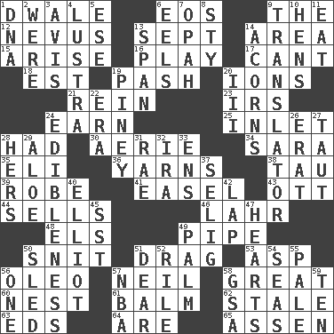 ACROSS 1. A sleeping potion; an opiate (poet.) 6. Greek goddess of the dawn 9. Definite Article 12. Congenital growth or mark on the skin 13. Back-to-school mo. 14. Type of rug 15. Originate 16. Romp 17. Patter 18. Eastern Standard Time (abbr.) 19. Romantic infatuation 20. Charged atoms 21. It's straight from the horse's mouth 23. Big collection agency 24. Merit 25. An arm off of a larger body of water 28. Possessed 30. Nest on high 34. "Two Mules for Sister ____" 35. Connecticut Ivy Leaguer 36. Entertaining tales 38. The 19th letter of the Greek alphabet 39. Loose flowing garment 41. Artist's stand 43. Baseball player Mel 44. Makes a sale 46. Cowardly lion portrayer 48. Raised railways 49. Corncob 50. In a ____ (agitated or irritated) 51. To draw with force 53. Cleo's killer 56. Margarine 57. Famous astronaut Armstrong 58. Relatively large 60. A home for chicks 61. Lip ointment 62. Showing deterioration from age 63. Begley and Asner 64. "We ___ not amused" (Victoria) 65. NE Netherlands city DOWN 1. Heredity factor (abbr.) 2. Past tense of be (plural) 3. Opinion 4. A period of five years 5. Compass dir. 6. Snakelike fish 7. Brightly colored fish 8. Filthy place 9. Interpreter 10. Coop moms 11. Ingest 13. Connect, as a bridge 14. Oak nuts 19. Abounding in pines 20. One more than two 22. Epoch 24. The property of being fit to eat 26. Part of Q.E.F. 27. Strained 28. Possessive pronoun 29. Medicinal plant 31. Actress Charlotte 32. Lyricist Gershwin 33. Followers of ems 37. Major League Baseball Commissioner Bud 40. American author Paul (1891-1958) 42. Pet locale 45. Fast jet (abbr.) 47. Centers of feelings and intuitions 49. Inside of hand 50. Downhill vehicle 51. Letter starter 52. Cause heat under the collar 54. Oceans 55. Diluted with white 56. Single 57. Basketball assoc. 58. Girls' org. (abbr.) 59. Nine, plus one