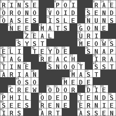 ACROSS 1. Wash lightly 6. Luau course 9. Actress Charlotte 12. U. of Maine site 13. Lacking any legal or binding force 14. Post 15. Fertile tracts in a desert 16. Capri or Wright 17. Religious women 18. Born 19. Floor coverings 20. Went 21. Ardor 23. RI univ. 24. System (abbr.) 25. Catcalls? 28. Connecticut Ivy Leaguer 30. Miss Universe 1986, Barbara Palacios _ 34. Fastener 35. Label 36. Arrive at 38. Retirement account (abbr.) 39. Prong on a fork 41. Snob 43. Fast jet (abbr.) 44. Believer in; advocate of (suffix) 46. Vertical spar for supporting sails 48. Bear (Spanish) 49. Ancient Persian 50. Group working together 51. Aroma 53. Pass on 56. Silvers or Donahue 57. Wrote a lyric poem 58. Is inclined (to) 60. Observes 61. French philosopher Descartes 62. Bert's buddy 63. Big collection agency 64. Tate display 65. NE Netherlands city DOWN 1. Friend of Pooh 2. SW Asia republic 3. Characteristic smell of wine 4. Dwarf with a sinus problem 5. Greek goddess of the dawn 6. Mail 7. Lubricates 8. Binary compound 9. One who advocates reunion 10. Singer Murray 11. Begley and Asner 13. Small bottle 14. Sounds asleep 19. Mother 20. Chewing product 22. Eastern Standard Time (abbr.) 24. Seigniories (variant) 26. Armed conflicts 27. Argument over a trivial matter 28. Singer James 29. Den 31. Consenting reply 32. Daniel's nick name 33. Environmental prefix 37. Baseball hit which scores a run 40. Artist's stands 42. Small boy 45. At this time 47. Spring feasts 49. Method 50. "Mermaids" star 51. Baltic tributary 52. Gouge 54. Lodging establishments 55. Singer Brickell 56. 23rd letter of the Greek alphabet 57. Mouth or opening 58. Afternoon social gathering 59. Elected rep.