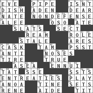 ACROSS 1. Night before a holiday 4. Corncob 8. Is not 12. Food container 14. An important port of Yemen 15. Letter starter 16. Nathan's nickname 17. Unrelated to defense, as in spending 20. Toward shelter 21. Bear (Spanish) 22. Had dinner 23. Narrow boards 27. Religious group 29. 480, 500 or 516 sheets of paper 31. Hero or heavy, e.g. 34. Lacking originality or spontaneity 35. Ancient Greek god of war 36. Keg 39. Scottish cap 41. Inconspicuous attention getter 42. Against 43. Olfactory organs 46. Hoop that covers a wheel 47. Loyal 48. Toward the sea 51. World-weariness 54. Make lace 56. Compass dir. 58. Fast planes 61. Pleas 66. Frolic 67. Small Philippine buffalo 68. Prong on a fork 69. Arranges properly for use 70. French philosopher Descartes 71. Helper 72. Teat (slang) DOWN 1. Pulitzer Prize-winning author Ferber 2. Small bottle 3. _____ Park, CO 4. Baking dish 5. Wedding promise 6. Fenced enclosure 7. Inside; within (prefix) 8. Binary compound 9. Legislators 10. Political cartoonist Thomas 11. Relationship diagram 13. The bottom of a shoe or boot 18. Curvy letter 19. Enemy 24. Nonscientific branch of learning 25. Beverage made from leaves 26. Table seasoning 28. Dice game 30. Intended 32. French article 33. Eastern Standard Time (abbr.) 34. Atmospheres 36. Feline 37. Cuckoo 38. Ski resort town in Vermont 40. Greater amount 44. Player for Phoenix 45. Car or cant ending 49. Compass dir. 50. White ___ sheet 52. United States Postal Service (abbr.) 53. Small island 54. Lacerate 55. Singer Murray 57. Singer James 59. Jacques of French films 60. System (abbr.) 62. Actress Charlotte 63. One more than two 64. Conclude 65. Observe