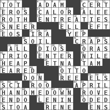 ACROSS 1. Small child 4. First man 8. An absolute certainty 12. Greek god of love 14. Bodily heat indicating an inflammation 16. Toward shelter 17. Writer of Portnoy's Complaint (1969) 18. Pleas 20. Scornful expression 22. Pipe bend 23. Lizard (obsolete) 24. Greek goddess of the dawn 25. Lyricist Gershwin 28. Slangy assent 30. The visible part of the earth's surface 31. Dice game 35. Everything 37. "Vaya con ____" 40. Mouths or openings 41. Musical group of three 42. Keyboard key 44. "Death on the ____" 45. Pile 46. Inactive volcano in Sicily 47. Scottish cap 48. Having ears or earlike features 50. Von Bismarck 52. Spanish title 54. To riddle 55. Raised railways 58. _-fi 61. Friend of Pooh 63. Showery time 65. Sleeping bag shop? 70. Be footloose 71. Inside; within (prefix) 72. Soviet premier 1918-24 73. Wrote a lyric poem 74. Portico 75. French philosopher Descartes 76. Followers of ems DOWN 1. Laconic 2. U. of Maine site 3. Hauls 4. Adept person 5. Daniel's nick name 6. The first octave above the treble staff 7. Greater amount 8. Feline 9. Writer Wiesel 10. Coral collection 11. Trial 13. A female animal or person 15. Depend 19. Actor Baldwin 21. River (Sp.) 26. Travel on an animal 27. Place in a line 29. Right away 30. Slanted 32. Roberta Peters solo 33. Inside of hand 34. Compass dir. 35. Length times width 36. One who doesn't tell the truth 38. Baseball player Mel 39. Sir (Sp.) 41. Definite Article 43. Pace 49. Dormintory (informal) 51. Beverage made from leaves 53. Christmas carol 55. Wear away 56. Make or become more lively 57. Bobsleighs 58. "______ My Girl" (Turtles hit) 59. Patter 60. Southeast Asian peninsula 62. Baltic tributary 64. Adept person 66. ___ good deed 67. Single 68. Victory 69. Compass dir.