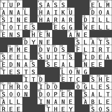 ACROSS 1. Uncastrated adult male sheep 4. Backtalk 8. Shade tree 11. Of or related to the anus 13. Japanese verse 15. ___ good deed 16. Trig term 17. Ethiopian city, capital of Harari 18. Deli pickle 19. Hauls 21. Ovum 22. Water source 23. Followers of ems 24. Layer 27. A saturated hydrocarbon 29. Centimeter-gram-second unit of force 30. Narrow boards 34. Madame (abbr.) 36. Movie discs 39. Seductive woman who exploits men 40. Sew up the eyelids of hawks and falcons 41. Sets or collections 43. It may be bright or harebrained 44. Ferber et al. 46. Lick closed 47. Born 48. Trials 49. Having great length 51. It would 53. And so on (abbr.) 54. A female animal or person 57. Through, poetically 60. Wedding promise 63. Stares at amorously 65. Within a short period 66. Drug addict 69. Table seasoning 70. Everything 71. Empty; void 72. Competent 73. To riddle 74. Those things 75. Distress signal DOWN 1. Clothes sense 2. The state of being joined or united 3. Leg coverings 4. Quiet! 5. American Automobile Association (abbr.) 6. Male parent of an animal 7. Heroin 8. Singer Brickell 9. Hang loosely or laxly 10. Shopping center 12. Area sheltered from the wind 14. Capital and largest city of Mongolia 18. Residence 20. Like a shrinking violet 25. Extremities 26. Congenital growth or mark on the skin 28. Overdraft (abbr.) 29. Accusation by an informer 31. Helper 32. Relationship diagram 33. R.R. building 34. Ancient Persian 35. Not women's 37. Expire 38. Lacking originality or spontaneity 40. Arrange properly for use 42. Groove 45. Fast jet (abbr.) 50. Non-commissioned officer (abbr.) 52. "You Light Up My Life" star Conn 54. Thick slices 55. Phone greeting 56. _____ Park, CO 57. Russian ruler of old 58. Opening into or through something 59. Hero or heavy, e.g. 61. Do not 62. Brightly colored fish 64. Girls' org. (abbr.) 67. Compass dir. 68. Marina Del _, California