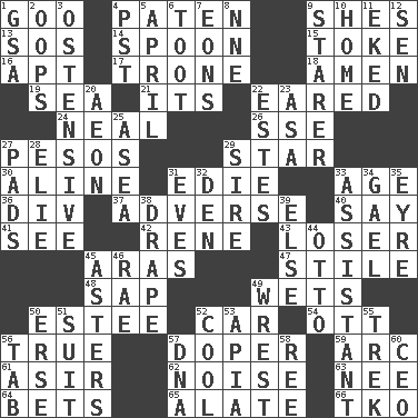 ACROSS 1. Thick or sticky substance 4. Eucharist need 9. "______ My Girl" (Turtles hit) 13. Mayday 14. Soup utensil 15. Casino tip 16. Fitting 17. Heavy duty weighing machine 18. So be it 19. Ocean 21. It is 22. Having ears or earlike features 24. Actress Patricia 26. Compass dir. 27. Mexican monetary units 29. Play the lead 30. Place in a line 31. Singer Brickell 33. Personal question 36. HTML Container Element 37. Contrary to your interests or welfare 40. Declare 41. Observe 42. French philosopher Descartes 43. Failure 45. Caspian sea tributary 47. Vertical member of a panel or frame 48. Plant excrement 49. Soaks 50. First name in cosmetics 52. 4-wheeled motor vehicle 54. Baseball player Mel 56. Loyal 57. Drug addict 59. Curve 61. SW Saudi Arabia district 62. Annoying sound 63. Born 64. Wagers 65. Having winglike extensions 66. Ring climax DOWN 1. Girls' org. (abbr.) 2. I made a mistake 3. Clearly or manifestly demonstrative 4. Pacific Standard Time (abbr.) 5. Showery time 6. A blast of a horn 7. Immeasurably long periods of time 8. Compass dir. 9. A viewer who gazes fixedly 10. Residence 11. Supplemented with great effort 12. Elected rep. 20. Period of immesurable duration 22. _____ Park, CO 23. White ___ sheet 25. Toward the sea 27. Groovy apts. 28. Writer Wiesel 29. Father 31. Nights before holidays 32. Lair 33. Helper 34. Highlander 35. Jane of fiction 38. Window treatment 39. Otherwise 44. "Beetle Bailey" pooch 45. Michaelmas daisies 46. Actress Charlotte 49. Take or capture by force 50. Celtic language 51. Set of matching outer garments 52. Calm and collected 53. Capital of Western Samoa 55. Long journey 56. Bar bill 57. Heredity factor (abbr.) 58. Portuguese money of account (variant) 60. Corporate head (abbr.)