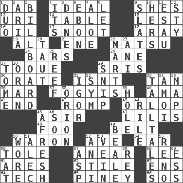ACROSS 1. Small moist lump or mass 4. Standard of perfection 9. "______ My Girl" (Turtles hit) 13. RI univ. 14. Eating place 15. For fear that 16. Petroleum 17. Snob 18. Like ___ of sunshine 19. The first octave above the treble staff 21. Compass dir. 22. Taiwanese island in East China Sea 24. Drinking establishments 26. A saturated hydrocarbon 27. Woman's close-fitting hat 29. Indian titles of respect 30. Declaim 31. Is not 33. Scottish cap 36. Make imperfect 37. Out of fashion; old fashioned 40. Nursemaid (var.) 41. Conclusion 42. Play 43. Lowest deck of a ship 45. SW Saudi Arabia district 47. Ms. Damita and namesakes 48. Egg _ yung 49. Waist strap 50. Make _____ (do battle with) 52. "___ Maria" 54. Hearing organ 56. Lacquered or enameled metalware 57. Approach 59. Area sheltered from the wind 61. Ancient Greek god of war 62. Vertical member of a panel or frame 63. Followers of ems 64. Technology 65. Abounding in pines 66. Distress signal DOWN 1. Superhero pair 2. Roberta Peters solo 3. Big road sign 4. ___ a Wonderful Life 5. Natives or inhabitants of Denmark 6. Inky black, to poets 7. Medicinal plant 8. Allow 9. Chalkboards 10. Possessive pronoun 11. Son of Isaac 12. Filthy place 20. Tense 22. Shops 23. Black tropical American cuckoo 25. Coral collection 27. Heavy book 28. NW Algerian seaport 29. Clip 31. Composer Stravinsky 32. Symbol (abbr.) 33. Baron Munchausen's specialties 34. Mine, in Marseilles 35. Atlas contents 38. Greek mythologigal hunter 39. Opening into or through something 44. Cause heat under the collar 45. Anew 46. "Barney Miller" actor Jack 49. Memphis, Tenn. Street 50. Had on 51. Actor Baldwin 52. Opposed to 53. Distinctive style or manner 55. Western Nevada city 56. Make lace 57. Viper 58. Marina Del _, California 60. Double-curved letter