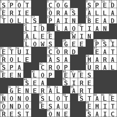 ACROSS 1. Blemish 5. Gear tooth 8. Broke a traffic law 12. 4th largest of the Great Lakes 13. Mouths or openings 15. Silent film actress Nazimova 16. For Whom the Bell _____ 18. Ache 19. Necklace unit 20. Flaplike covering 22. Of or relating to Laos or its people 24. Toward shelter 26. Acquire through effort 27. Coldest temperatures 28. Unit of force equal to gravity 29. 23rd letter of the Greek alphabet 32. Needle holder 35. Drawstring 37. Ingest 38. Hero or heavy, e.g. 39. White ___ sheet 40. Hindu Mythology: god of death 41. Health resort 42. Riding implement 43. Mountain range 44. Car or cant ending 45. Trim (branches) 46. Nights before holidays 49. Ocean 50. Father 51. Commissioned military rank 55. Nonscientific branch of learning 56. Words to Nanette 57. Narrow, elongated depression 59. Having lost freshness 63. Southwest Nigerian state 64. Son of Isaac 65. Send forth 66. Respite 67. Single 68. Ketch in the Levant DOWN 1. Put into a specified state 2. Adept person 3. Lubricate 4. Copy Pinocchio 5. Police officer (slang) 6. Of the mouth 7. Greek goddess of the earth (variant) 8. Unit of acoustic absorption 9. Entreaty 10. Liveliness 11. Male parent 14. Frozen precipiation fell 17. Grain storage tower 21. Morning condensation 23. Standoff 25. Fortification 28. Raisin fruits 29. Lightbulb-shaped fruit 30. "Two Mules for Sister ____" 31. Slanted text style (abbr.) 32. Celtic language 33. Drink excessively 34. ____ Bator 36. Bear (Spanish) 40. French bagpipes 42. Unrefined 45. Area sheltered from the wind 47. By way of 48. Blunders 49. Snob 51. Went 52. Conclusions 53. In addition 54. Grant temporary use of 56. Or not 58. Third day of the wk. 60. Nursemaid (var.) 61. Cards in a Roman deck? 62. And so on (abbr.)