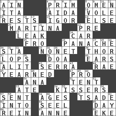 ACROSS 1. The 18th letter of the Arabic alphabet 4. Demure 8. Presage 12. Call ___ day 13. Opera by Verdi 14. Short-tailed, large-bodied rat 15. Musical pauses 18. Russian composer Stravinsky 19. Otherwise 20. Chrissie's court nemesis 22. Before (prefix) 23. Path through which fluid escapes 24. Automobile 25. From 26. Flamboyance 30. R.R. building 33. Music written for nine 36. Son of Odin 37. Chops off 39. ___ good deed 40. Hearing organs 41. Set down 42. Father Junipero _ 44. Actress Charlotte 45. Had a strong desire 47. Adept person 50. Santa ___, CA 51. Portable shelter 53. Had dinner 54. Smoochers 57. Posted 59. Ripens 61. Sadhe (variant) 63. To the inside or interior of 64. Stitch closed the eyes of (a falcon) 65. 24 hours 66. It's straight from the horse's mouth 67. Queen of England 1702-14 68. Make supply last DOWN 1. Wind 2. A distinct part 3. Relating to the nose 4. Ache 5. Port city in Latvia 6. Wedding promise 7. Impair 8. Make much ado about nothing 9. Undercover agent 10. Raised railways 11. Born 16. Unclean, religiously 17. Play the lead 21. Image 22. Baking dish 24. Feline 26. Lightbulb-shaped fruit 27. Burn to charcoal 28. Israeli folk dance 29. Celtic language 30. Kill 31. Lacquered or enameled metalware 32. Capital of Western Samoa 34. Wrote a lyric poem 35. Not either 38. Ski resort town in Vermont 42. Ocean 43. Tenement units (abbr.) 46. Compass dir. 48. Take ten 49. Singles 52. Swap 53. Opposed to 54. Peachy ____! 55. Small island 56. Neighbor of Neb. 57. Title for a knight 58. Compass dir. 59. White ___ sheet 60. Commissioned military rank (abbr.) 62. Sight organ