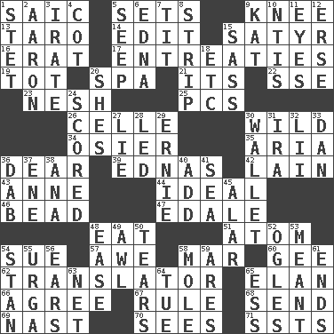 ACROSS 1. Ketch in the Levant 5. Puts into a specified state 9. Leg joint 13. Edible starchy tuberous root 14. Prepare for publication 15. Letch 16. Part of Q.E.F. 17. Pleas 19. Small child 20. Health resort 21. ___ a Wonderful Life 22. Compass dir. 23. Soft 25. Personal Computers (abbr.) 26. Cell (Danish) 30. Uncontrolled 34. Flexible twig of a willow tree 35. Operatic vocal solo 36. Letter starter 39. Ferber et al. 42. (Had) reclined 43. Queen of England 1702-14 44. Perfect 46. Necklace unit 47. Peak District village in England 48. Ingest 51. Tiny particle 54. Take to court 57. Deep reverence 58. Third mo. 60. Turn to the right 62. Interpreter 65. Enthusiasm 66. Match 67. Court order 68. Transmit 69. Political cartoonist Thomas 70. Perceives with the eye 71. Fast planes DOWN 1. Proofreading order 2. Composer Copland 3. Feeling or showing extreme anger 4. Small bed 5. Ooze 6. Pulitzer Prize-winning author Ferber 7. Teat (slang) 8. Remove all contents or possession from 9. Krazy ___ of comics 10. Nuclear Threat Initiatives 11. Snake ____ (dice throw) 12. Celtic language 15. Backtalk 18. And so on (abbr.) 20. "______ My Girl" (Turtles hit) 24. Tallied 27. Untruth 28. Directed 29. Bert's buddy 30. Place for singles 31. Retirement account (abbr.) 32. Cards in a Roman deck? 33. One of the 12 tribes of Israel 36. Pat or tap gently 37. Compass dir. 38. Santa ___, CA 40. Increase 41. Ocean 45. Having or resembling wings 48. Relaxation 49. Leather borer 50. Pulls apart 52. Stares 53. Intended 54. Comedian Laurel of Laurel & Hardy 55. Capital and largest city of Mongolia 56. Hearing organs 58. Undercover agent 59. Ancient Greek god of war 61. Extremities 63. Fish or hair follower 64. Third day of the wk. 65. Double-curved letter