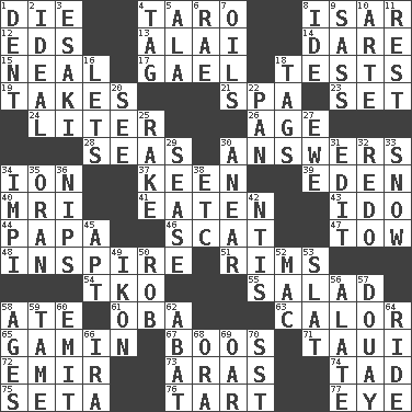 ACROSS 1. Pass on 4. Pacific island yam 8. Austrian river, tributary to the Danube 12. Begley and Asner 13. Jai ____ 14. Have the gumption 15. Anneal 17. Highlander 18. Trials 19. Proceeds 21. Health resort 23. Put into a specified state 24. 61 cubic inches 26. Grow older 28. Oceans 30. Replies (to) 34. Electrically charged atom 37. Peachy ____! 39. Paradise 40. Medical imaging device (abbr.) 41. Eroded 43. Wedding promise 44. Dad 46. Leave at once 47. Pull behind 48. Motivate 51. Basketball hoops 54. Ring climax 55. Vegetable dish 58. Had dinner 61. Chief or king in Benin or Nigeria 63. Bodily heat indicating an inflammation 65. Homeless child 67. Expressions of contempt or scorn 71. "Change" in Tahitian 72. Arab leader 73. Caspian sea tributary 74. Small boy 75. Stalk of a moss capsule 76. Small pie 77. Sight organ DOWN 1. Gouge 2. Perfect 3. 1973 Nobel Price Winner (Physics) Leo 4. Label 5. Insect wing 6. Actress Charlotte 7. Petroleums 8. Binary compound 9. Backtalk 10. Johnson of "Laugh-In" 11. Respite 16. Allows 18. Labels 20. Observe 22. Baking dish 25. Immoral or dissolute person 27. She-sheep 29. Gospel singer Marvin 30. Approach 31. Prepare for publication 32. Redecorate 33. Frozen precipitation 34. Body of Kaffir warriors 35. Northwest Algerian city 36. Cuts off 38. And so on (abbr.) 42. Nuclear Threat Initiatives 45. Fitting 49. Visual representation of an object 50. Director Reiner 52. Apple computer (short form) 53. Narrow board 56. Having winglike extensions 57. A city in N France, SE of Calais 58. Matures 59. Not wild 60. Send forth 62. Blind as ____ 64. Travel on or in a vehicle 66. Lyricist Gershwin 68. Mouth or opening 69. Boat paddle 70. Fast jet (abbr.)