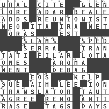 ACROSS 1. Mountain range 5. Quote 9. Small, secluded valley 13. Old wives' tales, e.g. 14. The sixth month of the Jewish calendar 15. Memphis, Tenn. Street 16. Sums up 17. One who advocates reunion 19. Modern: prefix 20. Call ___ day 21. Retirement account (abbr.) 22. Fish or hair follower 23. Mouths or openings 25. Eastern Standard Time (abbr.) 26. Criticizes harshly 30. Broke a traffic law 34. Father Junipero _ 35. SW Asia republic 36. Jacques of French films 39. Of or pertaining to a thread or threads 42. Globular water bottle used in Asia 43. Washington bills 44. Scent 46. Gone 47. Debunk (Brit. slang) 48. Greek goddess of the dawn 51. Seaweed 54. Institute legal proceedings 57. Direct toward a target or goal 58. Area sheltered from the wind 60. Electrically charged atom 62. Interpreter 65. Drawn tight 66. Match 67. Western Nevada city 68. Opposed to 69. Raze (variant) 70. Labels 71. 24-hour periods DOWN 1. ____ Bator 2. Cowboy competition 3. Zeal 4. French article 5. Draw slowly or heavily 6. It may be bright or harebrained 7. The 19th letter of the Greek alphabet 8. Bert's buddy 9. Commissioned mil. rank 10. (Had) reclined 11. Otherwise 12. Remaining after all deductions 15. Water vessel 18. Big collection agency 20. Small island 24. Help 27. Sandy's bark 28. Medical imaging device (abbr.) 29. Vegetable dish 30. Fodder prepared in a silo 31. Adept person 32. Consume 33. Heredity factor (abbr.) 36. Pull behind 37. One (Scot) 38. Nine, plus one 40. "We ___ not amused" (Victoria) 41. Director Reiner 45. Cause to be 48. Comfort 49. Lubricate 50. Don Adams' spy role 52. Woody, climbing, usually tropical plant 53. Marked by pouting 54. Play the lead 55. Capital and largest city of Mongolia 56. Hearing organs 58. Protracted 59. Greek god of love 61. Nuclear Threat Initiatives 63. Born 64. Afternoon social gathering 65. Small amount or degree