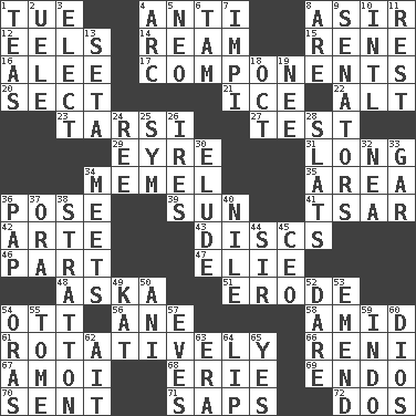 ACROSS 1. Third day of the wk. 4. Opposed to 8. SW Saudi Arabia district 12. Snakelike fish 14. 480, 500 or 516 sheets of paper 15. French philosopher Descartes 16. Toward shelter 17. Parts 20. Religious group 21. Frozen water 22. The first octave above the treble staff 23. Tarsus (plural) 27. Trial 29. Jane of fiction 31. Yearn 34. Klaipeda city 35. Type of rug 36. Introduce or present, as a question 39. Player for Phoenix 41. Russian ruler of old 42. Johnson of "Laugh-In" 43. Flat circles 46. Component 47. Writer Wiesel 48. "____ silly question..." 51. Eat (away) 54. Baseball player Mel 56. One (Scot) 58. Among 61. Rotating or pertaining to rotation 66. Painter Guido (1575-1642) 67. Mine, in Marseilles 68. 4th largest of the Great Lakes 69. Inside; within (prefix) 70. Posted 71. Plant excrements 72. Two (Sp.) DOWN 1. Beverages made from leaves 2. Ubangi River tributary 3. Voters do this 4. Curve 5. Modern: prefix 6. Scottish cap 7. Body of Kaffir warriors 8. "We ___ not amused" (Victoria) 9. Legislators 10. International (abbr.) 11. Respite 13. Bristle 18. Sep. follower 19. Born 24. To riddle 25. Symbol (abbr.) 26. Angers 28. Narrow boards 30. Evade 32. Teachers' org. 33. Slender fish 34. Confronts 36. Infant food 37. Mouth or opening 38. Ski resort town in Vermont 40. Mediterranean tributary 44. Title for a knight 45. Corporate head (abbr.) 49. Krazy ___ of comics 50. Black tropical American cuckoo 52. Have the gumption 53. Make improvements or corrections to 54. Mouths or openings 55. Heavy book 57. Nights before holidays 59. _ china 60. "Vaya con ____" 62. Small island 63. Period 64. Mouth edge 65. It is so