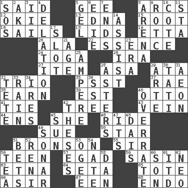 ACROSS 1. Expressed in words 5. Unit of force equal to gravity 8. Curves 12. Migrant worker of the '30s 13. Pulitzer Prize-winning author Ferber 15. Carrot, for example 16. Moves on water 18. Hats (slang) 19. Singer James 20. In the manner of 22. Substance 24. Ancient Roman robe 26. Retirement account (abbr.) 27. A distinct part 28. White ___ sheet 29. "One Day ___ Time" 32. Musical group of three 35. Inconspicuous attention getter 37. Actress Charlotte 38. Merit 39. Eastern Standard Time (abbr.) 40. "Beetle Bailey" pooch 41. Make a knot 42. Family _ (genealogy) 43. Distinctive style or manner 44. Followers of ems 45. A female animal or person 46. Travel on or in a vehicle 49. Take to court 50. Play the lead 51. "Death Wish" actor 55. Title for a knight 56. Adolescent 57. Mild oath 59. Indian antelope 63. Inactive volcano in Sicily 64. Bristle 65. Lug 66. SW Saudi Arabia district 67. Car or cant ending 68. Inside; within (prefix) DOWN 1. Mayday 2. Alias (abbr.) 3. One more than two 4. Conveyance 5. Set 6. Singer Brickell 7. Extremities 8. Sports stadium 9. College mil. group 10. ____ d'Azur (French Riviera) 11. R.R. building 14. Aid 17. Narrow opening 21. Ripen 23. Period 25. Electrical Unit 28. Michaelmas daisies 29. Johnson of "Laugh-In" 30. Jacques of French films 31. Period of immesurable duration 32. False hair 33. Water falling in drops from the sky 34. Angers 36. Compass dir. 40. Make much ado about nothing 42. College papers 45. Player for Phoenix 47. ___ a Wonderful Life 48. Raised platform 49. Underwater navigation system 51. Stakes 52. Painter Guido (1575-1642) 53. Double curve, resembling the letter S 54. Nathan's nickname 56. Beverage made from leaves 58. One of the 12 tribes of Israel 60. Boy, to dad 61. It would 62. Modern: prefix