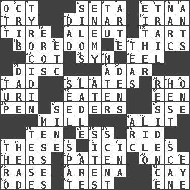 ACROSS 1. Sep. follower 4. Bristle 8. Inactive volcano in Sicily 12. Attempt to accomplish something 13. Middle Eastern gold or silver currency 14. SW Asia republic 15. Become fatigued 17. Native American of Southwest Alaska 18. Small pie 19. Mood resulting from idleness 21. Principles of right and wrong 23. Small bed 24. Symbol (abbr.) 26. Snakelike fish 27. Plate 28. The sixth month of the Jewish calendar 30. Bit 31. Chalkboards 34. 17th letter of the Greek alphabet 37. RI univ. 38. Eroded 39. Car or cant ending 40. Fenced enclosure 41. Spring feasts 42. Compass dir. 43. Place where flour is made 44. Came down and settled, as after flight 46. Nine, plus one 47. Curvy letter 50. To free from 51. College papers 54. Winter's stalactites 57. Possessive pronoun 58. Eucharist need 60. Single time 62. Raze (variant) 63. Sports stadium 64. Island 65. Lyric poems 66. Trial 67. Compass dir. DOWN 1. Baseball player Mel 2. Baby bed with high sides 3. Polypeptide antibiotic 4. Grain storage towers 5. Foe 6. The 19th letter of the Greek alphabet 7. Johnson of "Laugh-In" 8. One or the other 9. Go after with the intent to catch 10. Drug cop 11. Pismires 13. Male parent 16. Greek god of love 20. And so on (abbr.) 22. Afternoon social gatherings 25. Mother 27. Have the gumption 29. Habitations of wild animals 30. Uncastrated adult male sheep 31. Sew up the eyelids of hawks and falcons 32. Dipping utensil 33. Had dinner 34. Home 35. Behest 36. Single 41. Trig term 43. Makes clutter 44. Curve 45. _ and Stitch 46. Laconic 48. Locates 49. Aroma 51. Through, poetically 52. Froth on beer 53. Petty quarrel 55. _ tizzy (2 wds.) 56. Glance over 59. "We ___ not amused" (Victoria) 61. Sight organ