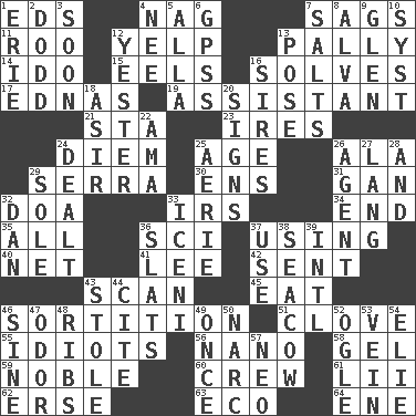 ACROSS 1. Begley and Asner 4. Tired old horse 7. Sinks 11. Friend of Pooh 12. Sharp bark 13. Friendly 14. Wedding promise 15. Snakelike fish 16. Finds the solution 17. Ferber et al. 19. Helper 21. R.R. building 23. Angers 24. South Vietnam president (1954) 25. Mature 26. Wing 29. Spanish missionary in California 30. Followers of ems 31. Separate the seeds from cotton 32. ___ good deed 33. Big collection agency 34. Conclude 35. Everything 36. _-fi 37. Putting into practice 40. Fish or hair follower 41. Area sheltered from the wind 42. Emitted 43. Skim 45. Consume 46. Drawing lots 51. Garlic unit 55. Foolish or stupid persons 56. Billionth: prefix 58. Set 59. Impressive in appearance 60. Group working together 61. Cards in a Roman deck? 62. Celtic language 63. Environmental prefix 64. Compass dir. DOWN 1. 4th largest of the Great Lakes 2. Texas town _ City 3. Within a short period 4. Born 5. Silent film actress Nazimova 6. Global Positioning Systems (abbr.) 7. Table seasonings 8. Inventor's middle name 9. Small, secluded valley 10. System (abbr.) 12. Next before 13. Introduce or present, as a question 16. Fathers 18. SW Saudi Arabia district 20. Omens 22. Nursemaid (var.) 24. Started a card game 25. Nest on high 26. Representative 27. Long (Scottish) 28. Plus 29. Not divided or shared with others 32. Daniel's nick name 33. Ancient Celtic tribe of eastern Britain 36. Narrow boards 37. Purpose 38. Manatee 39. International (abbr.) 43. Fur scarf 44. Quote 46. Trig term 47. Scent 48. Chest bones 49. At one time in the past 50. Drug cop 52. Stare 53. Distinctive style or manner 54. Writer Wiesel 57. Modern: prefix