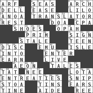 ACROSS 1. Sandy's bark 4. Oceans 8. Bowlike part 12. Small valley 14. Comfort 15. _ and Stitch 16. Small Philippine buffalo 17. Interpreter 20. Respite 21. ___ good deed 22. Numbers guy (abbr.) 23. Imelda's hoard 27. Brightly colored fish 29. Demure 31. Attach a signature 34. Having lost freshness 35. Adolescent 36. Compact _ 39. Australian flightless bird 41. Capri or Wright 42. To the inside or interior of 43. Keyboard key 46. Merit 47. Not recorded 48. Period of immesurable duration 51. Lies 54. Make lace 56. Born 58. Globular water bottle used in Asia 61. Pleas 66. Sever or remove by pinching or nipping 67. Portico 68. Canisters 69. Hearing organs 70. Prong on a fork 71. Helper 72. To sift DOWN 1. The sixth month of the Jewish calendar 2. French philosopher Descartes 3. Soft thread for cleaning between teeth 4. Arrange properly for use 5. Hearing organ 6. White ___ sheet 7. Post 8. Insect wing 9. Actors Guy, Robert Welles, and Clint 10. Hoof sound 11. Israeli folk dance 13. Thin strip of wood or metal 18. "Barney Miller" actor Jack 19. Infant locale 24. Elect 25. Epoch 26. Filth; sediment 28. Having gotten out of bed 30. Klaipeda city 32. Set 33. Compass dir. 34. Biscuitlike quick bread 36. Expire 37. _ tizzy (2 wds.) 38. Ski resort town in Vermont 40. A single undivided whole 44. Federal power corp. 45. Snakelike fish 49. Single 50. Teachers' org. 52. Otherwise 53. Echolocation 54. Trial 55. Opposed to 57. Singer James 59. Become fatigued 60. Domed church section 62. Actress Charlotte 63. One more than two 64. Conclude 65. Compass dir.